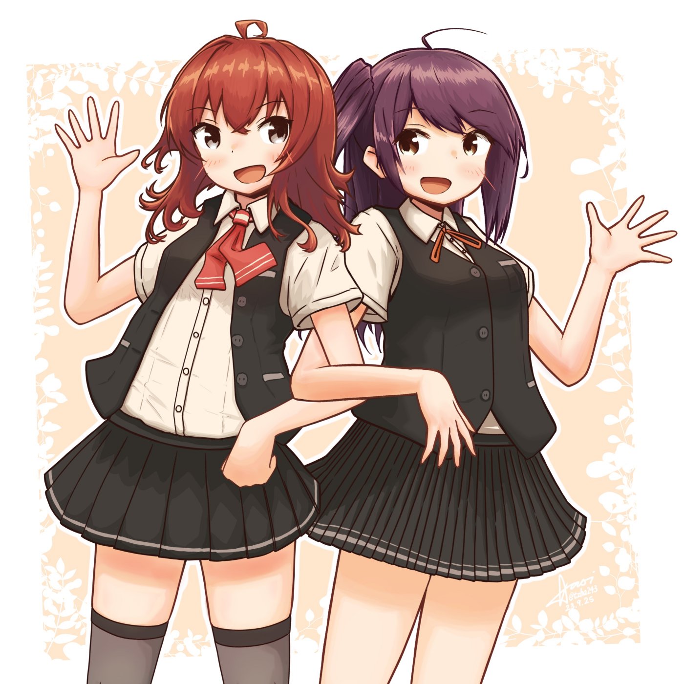 2girls aaoi ahoge arashi_(kancolle) black_vest brown_eyes collared_shirt commentary cowboy_shot dress_shirt grey_thighhighs hagikaze_(kancolle) highres kantai_collection locked_arms long_hair medium_hair messy_hair multiple_girls neck_ribbon neckerchief one_side_up purple_hair red_hair red_neckerchief red_ribbon ribbon shirt short_sleeves standing thighhighs vest waving white_shirt