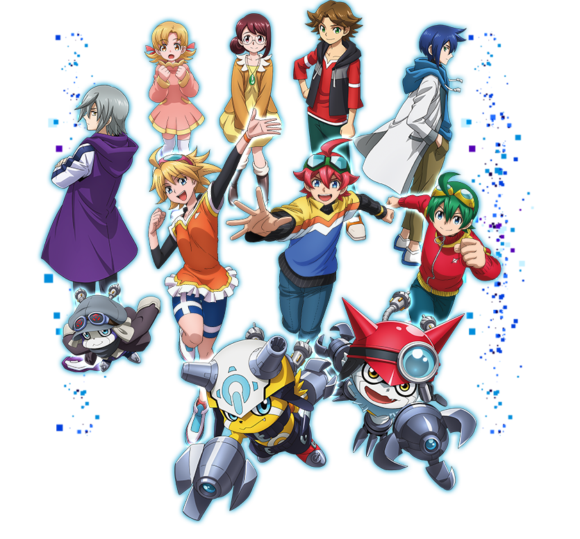 blue_eyes digimon digimon_universe:_appli_monsters fang goggles goggles_on_head hat helmet horns itsuki_(digimon) kazuki_(digimon) makoto_(appmon) mio_(digimon) naoto_(digimon) official_art offmon onmon ouji_(digimon) shinkai_haru smile yellow_eyes yukari_(digimon)
