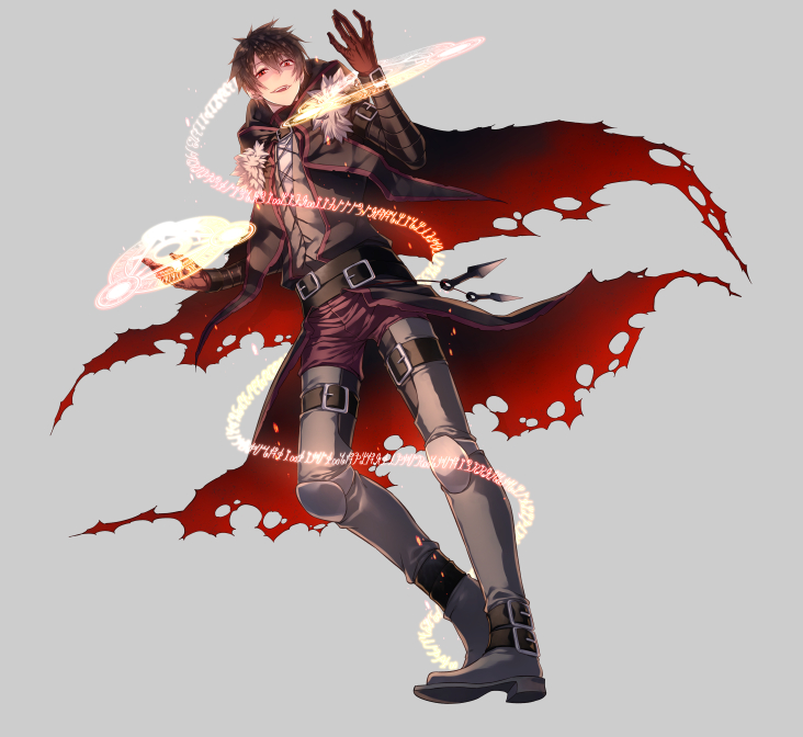 1boy \||/ ankle_belt arm_belt belt belt_buckle black_cape black_hair black_robe boots buckle cape commentary cross-laced_clothes cross-laced_top evans_raul evil_smile eyebrows_hidden_by_hair from_below fukushuu_wo_koinegau_saikyou_yuusha_wa_yami_no_chikara_de_senmetsu_musou_suru gloves gradient_cape grey_background grey_boots grey_shirt hair_between_eyes hand_up hood hood_down hooded_robe knee_pads knees_apart_feet_together kunai leg_armor magic_circle multiple_belts open_hands raoul_evans red_cape red_eyes red_gloves red_shorts robe sakamoto_akira shaded_face shirt shoe_soles short_hair shorts simple_background smile solo standing teeth thigh_belt thigh_boots thigh_strap too_many too_many_belts torn_cape torn_clothes torn_robe two-sided_fabric two-tone_robe upper_teeth_only weapon white_shirt wind wind_lift wrist_belt ||/