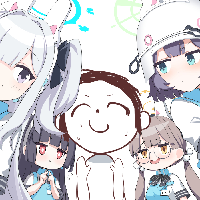 1boy 4girls angel's_24_uniform_(blue_archive) apron black_bow black_bowtie black_hair blue_apron blue_archive blue_eyes blue_halo bow bowtie brown_hair doodle_sensei_(blue_archive) glasses green_halo grey_headwear halo long_hair looking_at_viewer low_twintails miyako_(blue_archive) miyu_(blue_archive) moe_(blue_archive) multiple_girls one_side_up open_mouth polo_shirt purple_hair rabbit_platoon_(blue_archive) red_eyes round_eyewear saki_(blue_archive) sensei_(blue_archive) shirt shooka short_hair short_sleeves simple_background twintails two_side_up white_background white_hair white_shirt yellow_eyes yellow_halo