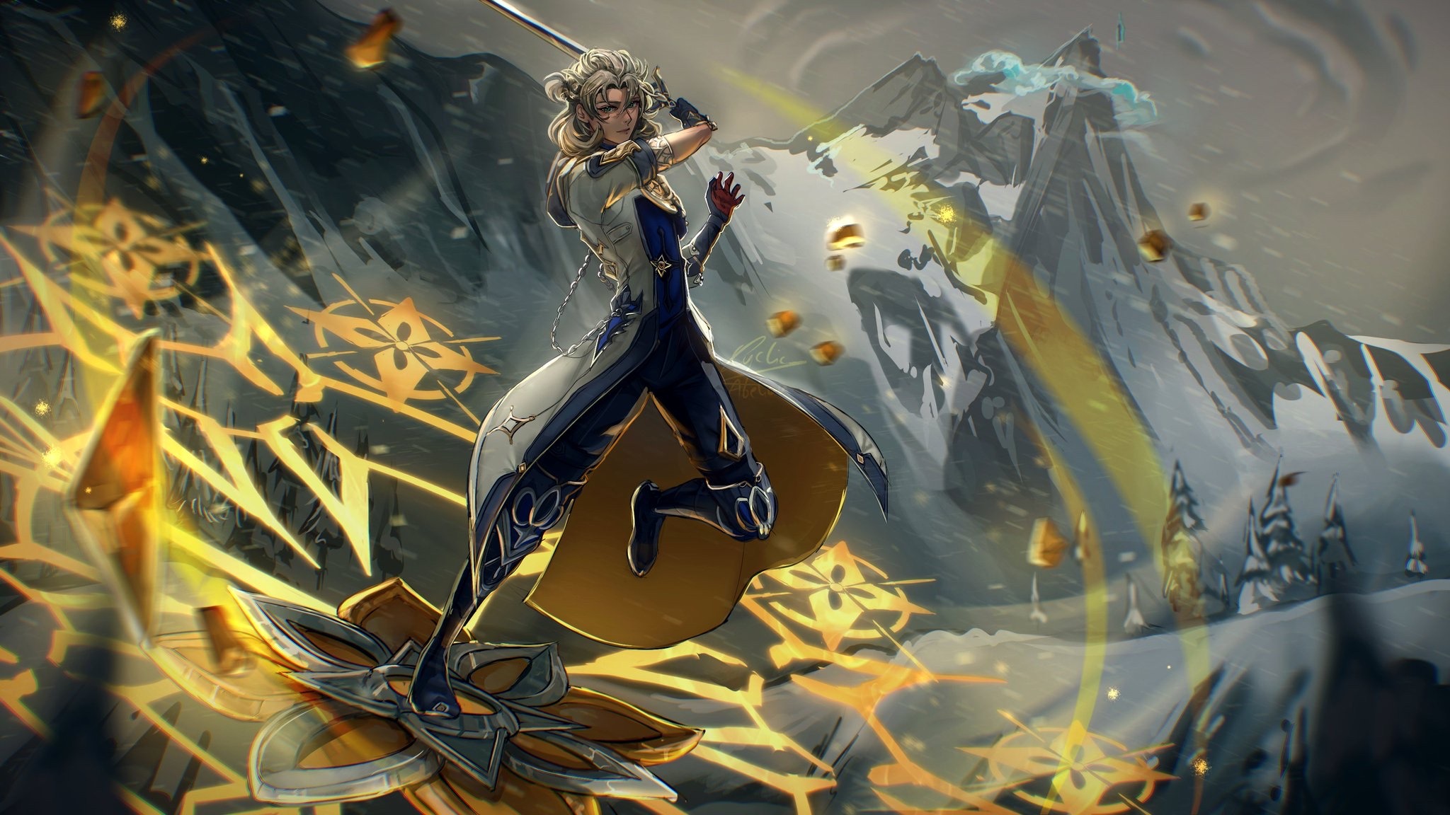 albedo_(genshin_impact) cyclic_abelian flower genshin_impact highres holding holding_sword holding_weapon magic magic_circle mountain signature snow sword tree weapon