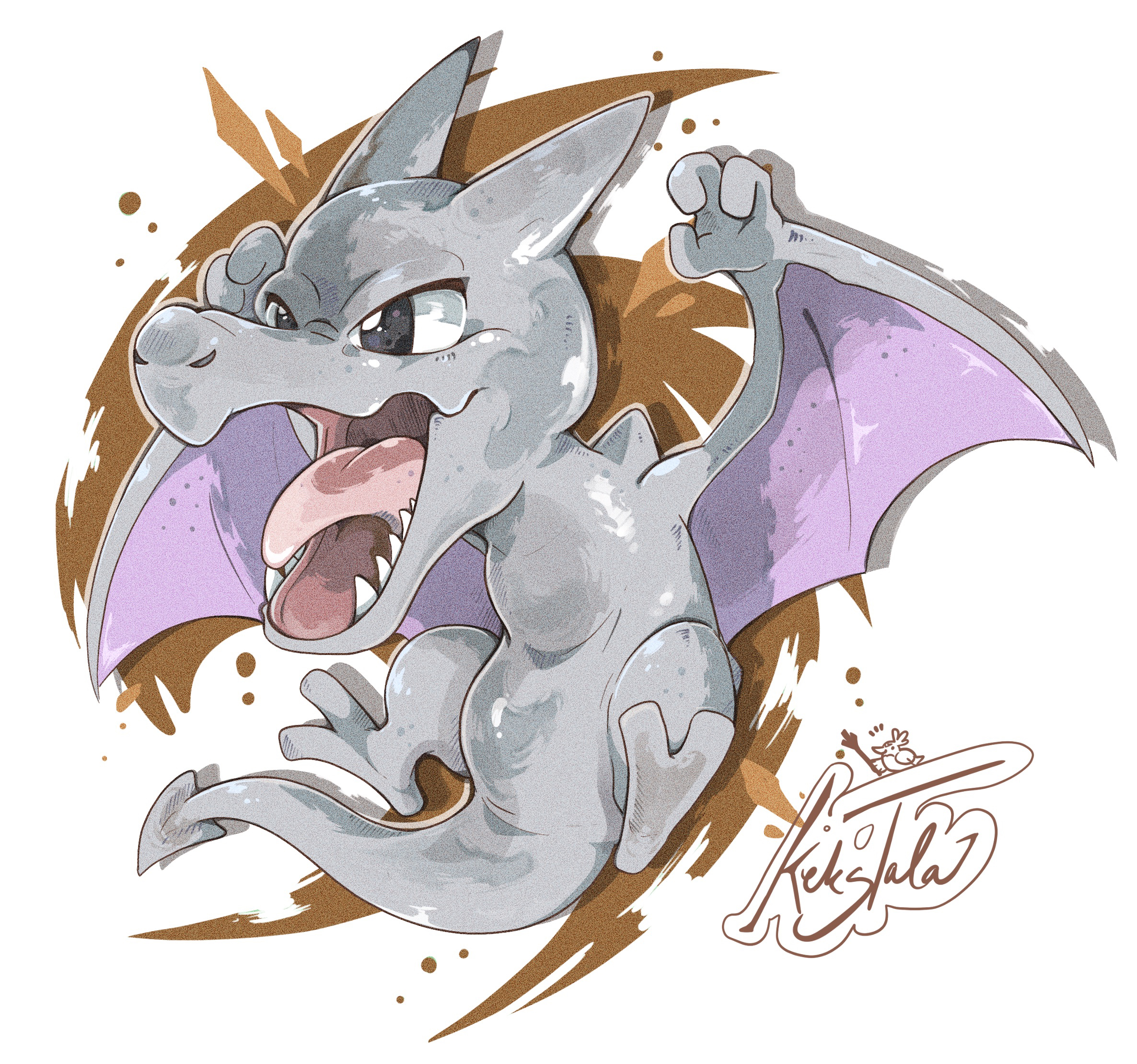 aerodactyl artist_name flying full_body gen_1_pokemon highres kekstala looking_to_the_side nintendo no_humans open_mouth pokemon pokemon_(creature) sharp_teeth solo teeth toon_(style)