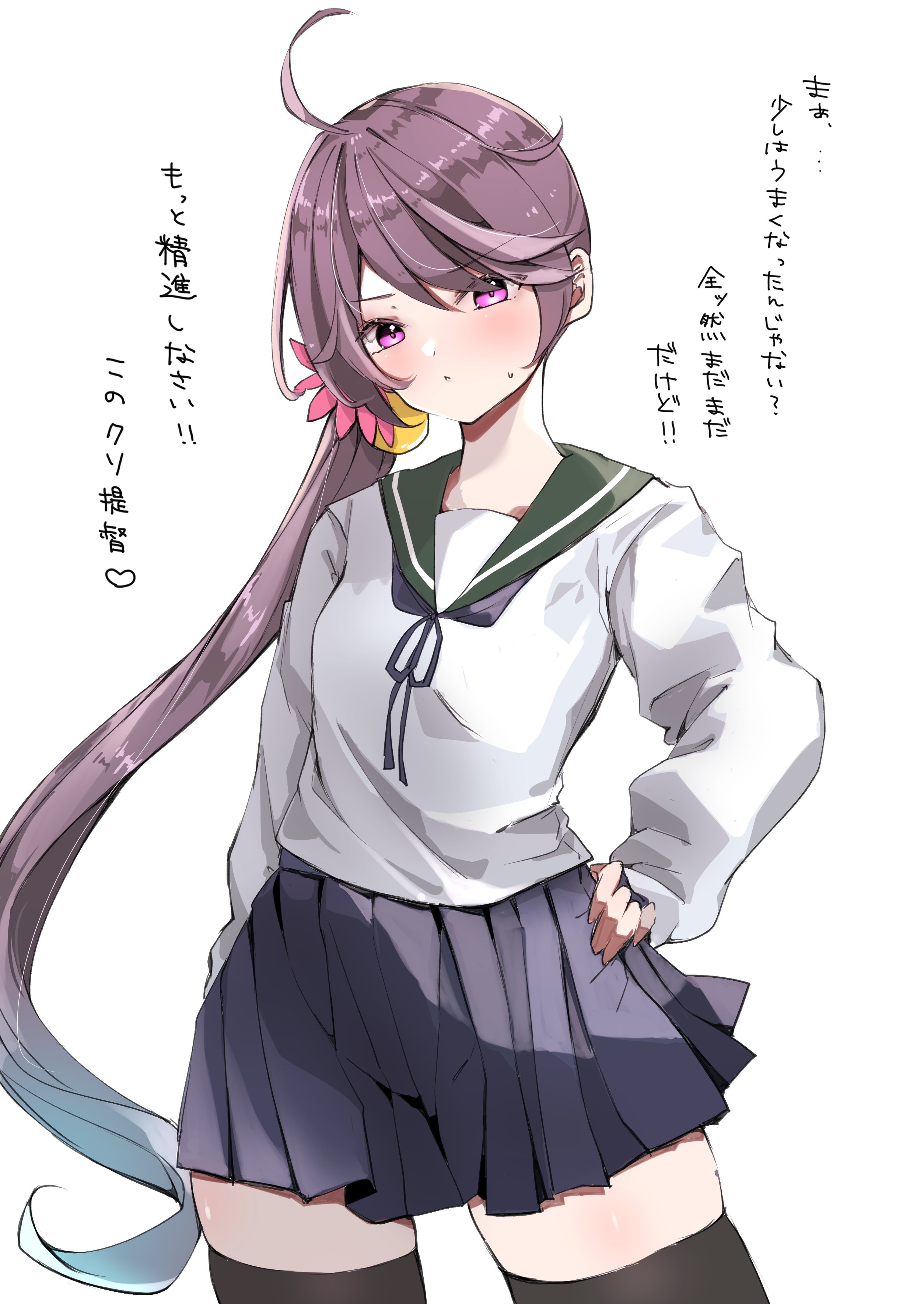 1girl absurdres adapted_costume akebono_(kancolle) alternate_sleeve_length bell black_thighhighs blue_neckerchief blue_sailor_collar blue_skirt commentary_request contrapposto cowboy_shot flower hair_bell hair_flower hair_ornament highres jingle_bell kantai_collection long_hair long_sleeves neckerchief pleated_skirt purple_eyes purple_hair sailor_collar school_uniform serafuku shitty_admiral_(phrase) side_ponytail simple_background skirt solo thighhighs translation_request very_long_hair white_background yoino_iyo