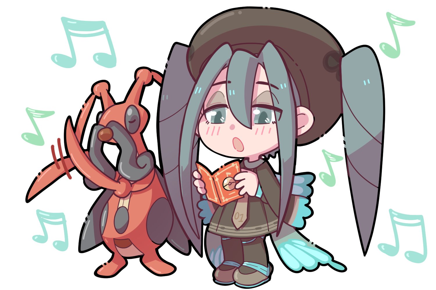 1girl angie_(dranoko) beamed_sixteenth_notes black_pantyhose blue_eyes blue_hair blue_wings blush brown_dress brown_headwear brown_necktie bug_miku_(project_voltage) chibi closed_eyes commentary dress eighth_note english_commentary eyeshadow full_body gen_4_pokemon grey_eyeshadow hair_between_eyes hair_through_headwear hat hatsune_miku holding kricketune long_hair long_sleeves looking_down makeup music musical_note necktie nintendo open_mouth pantyhose pokemon pokemon_(creature) project_voltage shoes singing standing twintails very_long_hair vocaloid white_background wings