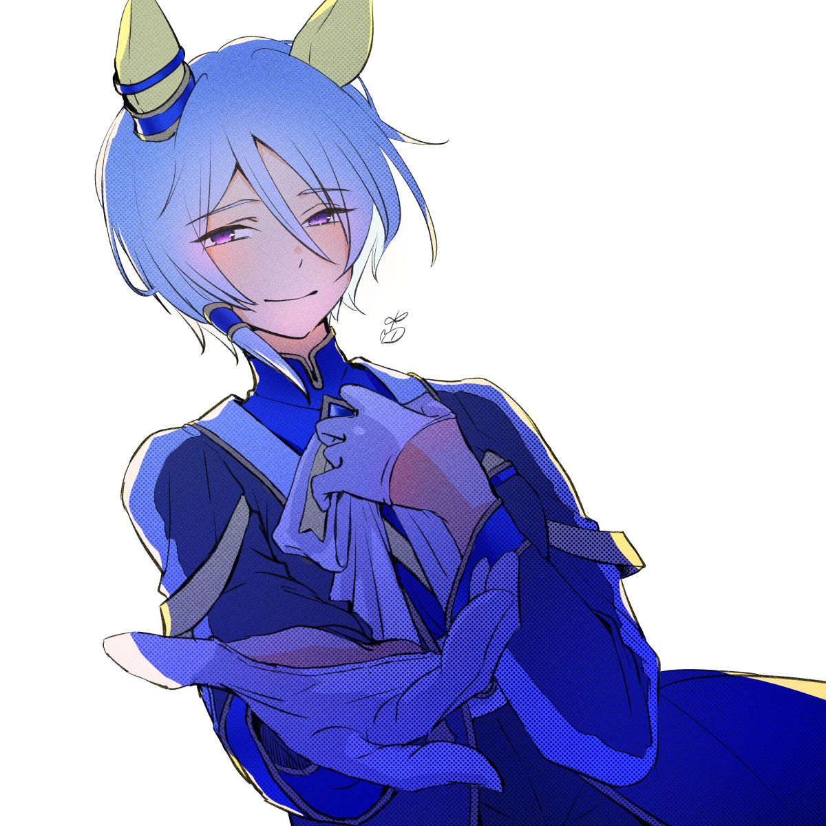 1girl animal_ears artist_logo blue_hair blue_jacket blue_shirt bow bowtie closed_mouth ear_covers gloves hair_between_eyes half-closed_eyes half_gloves hand_up highres horse_ears jacket k.s.miracle_(umamusume) logo long_sleeves looking_at_viewer nishioki_tama offering_hand open_clothes open_jacket outstretched_arm purple_eyes reaching reaching_towards_viewer shirt short_hair simple_background smile solo umamusume upper_body white_background white_gloves