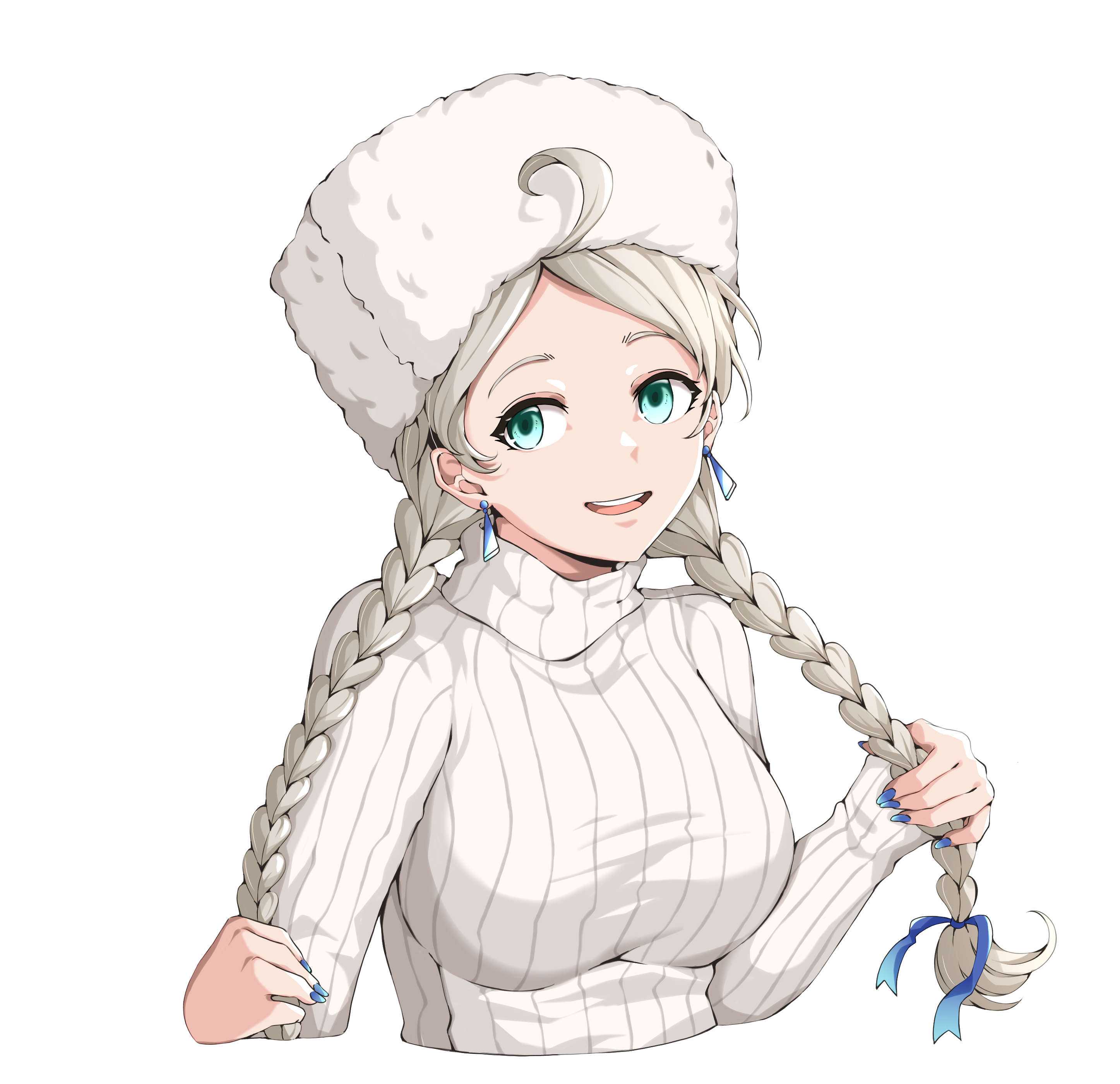 1girl absurdres ahoge alternate_costume blue_eyes blue_nails blue_ribbon braid breasts commission commissioner_upload crystal_earrings earrings facing_to_the_side fire_emblem fire_emblem_fates fur_hat grabbing_own_hair grey_hair hat highres holding_own_hair jewelry long_hair looking_to_the_side low_twin_braids medium_breasts nail_polish nina_(fire_emblem) nintendo non-web_source open_mouth parted_bangs ribbon solo sweater teeth turtleneck turtleneck_sweater twin_braids upper_body upper_teeth_only ushanka villager_c white_background white_hat white_sweater