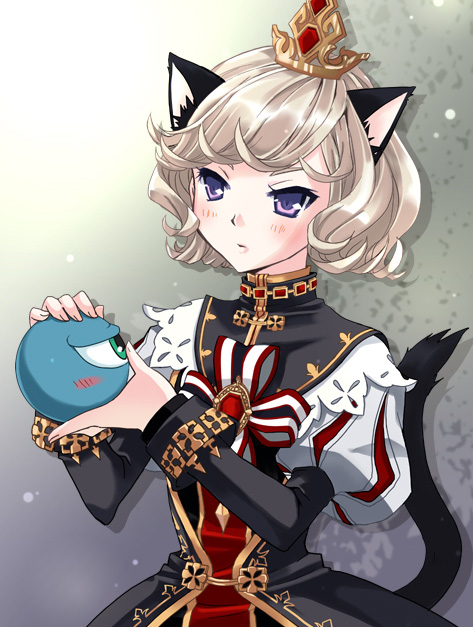 1girl animal_ears black_tail blonde_hair cat_ears cat_girl cat_tail closed_mouth crown dress drop_shadow eirawen_(mabinogi) fingernails gem gold_headwear juliet_sleeves koshikawa_guu long_sleeves mabinogi mini_crown puff_and_slash_sleeves puffy_sleeves purple_eyes red_gem short_hair solo tail