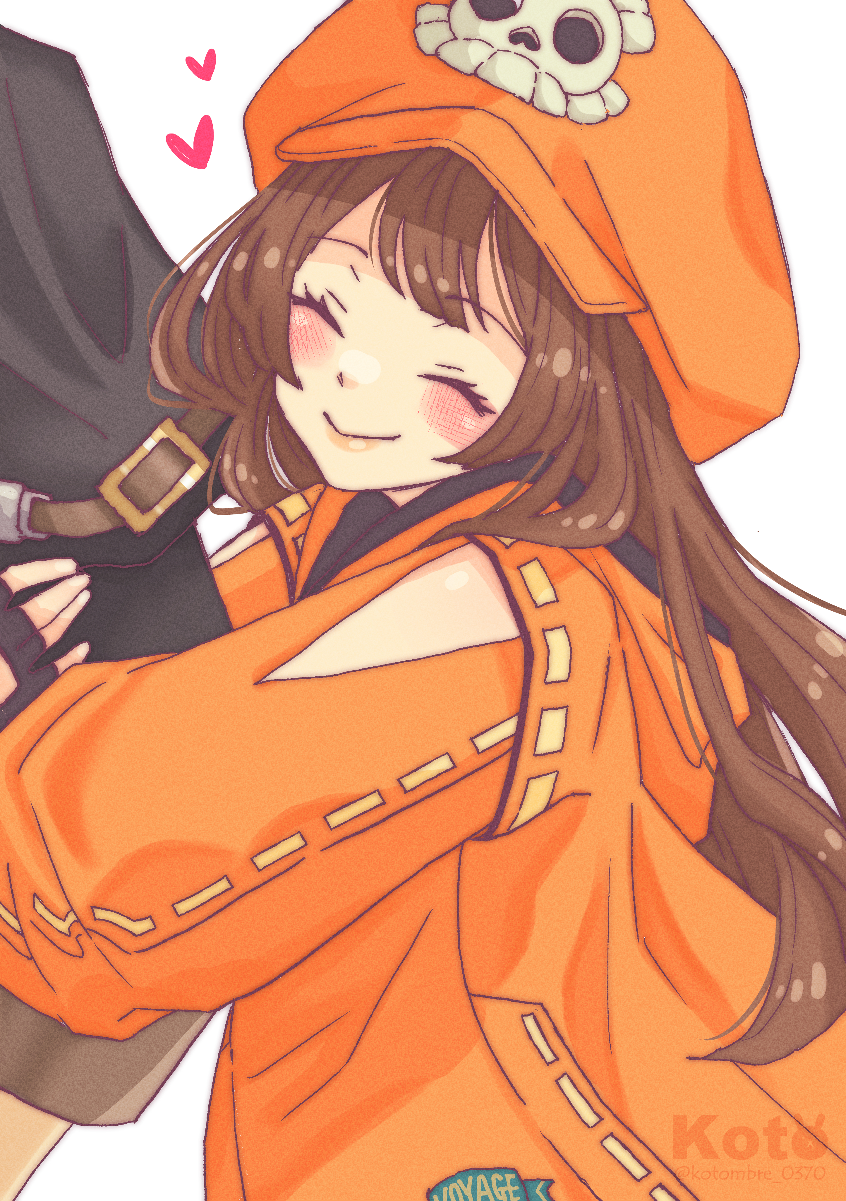 1boy 1girl absurdres brown_hair newsboy_cap guilty_gear guilty_gear_strive hat hat_ornament highres i_(kotombre_0370) johnny_(guilty_gear) long_hair looking_at_viewer may_(guilty_gear) orange_headwear orange_shirt pirate_hat shirt skull_and_crossbones skull_hat_ornament smile