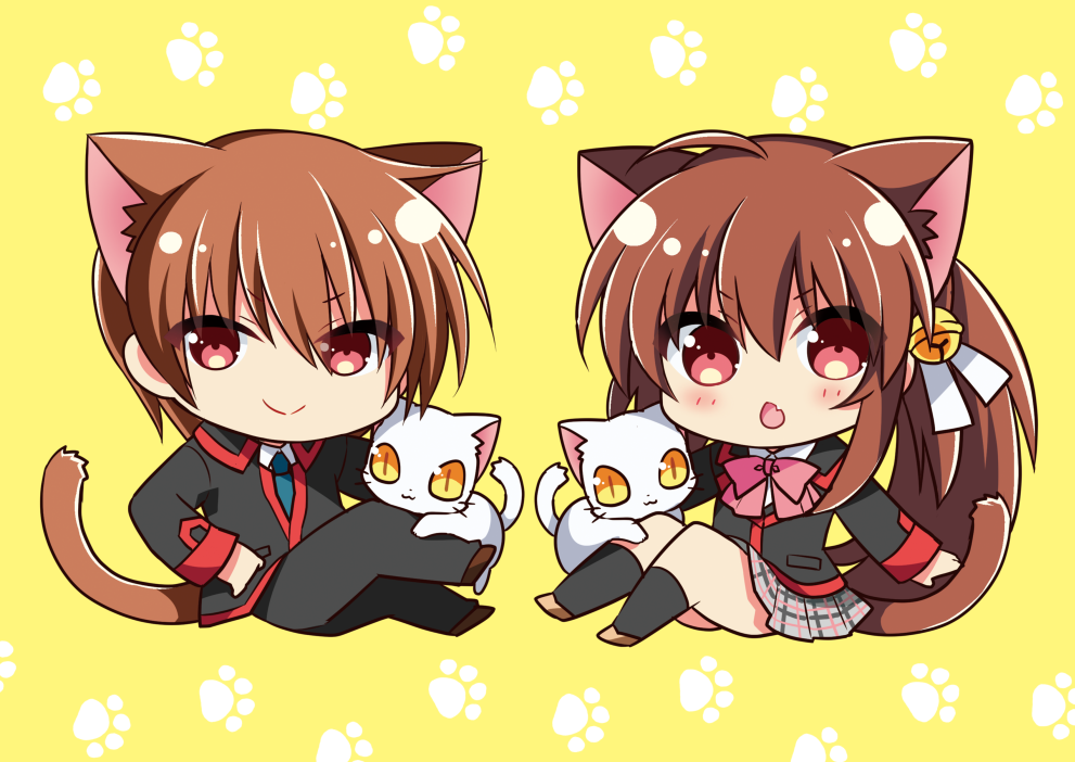 >:) 1boy 1girl ahoge animal_ear_fluff animal_ears arm_at_side black_jacket black_pants blue_necktie blush bow brother_and_sister brown_hair brown_tail cat cat_boy cat_ears cat_girl cat_tail chestnut_mouth chibi closed_mouth commentary_request eyes_visible_through_hair fang grey_skirt hand_on_own_hip hano_haruka jacket knees_up little_busters! little_busters!_school_uniform long_sleeves looking_at_viewer miniskirt natsume_kyousuke natsume_rin necktie open_mouth pants paw_print pink_bow plaid_clothes plaid_skirt pleated_skirt red_eyes school_uniform short_hair siblings simple_background skin_fang skirt smile tail tail_raised v-shaped_eyebrows white_cat yellow_background