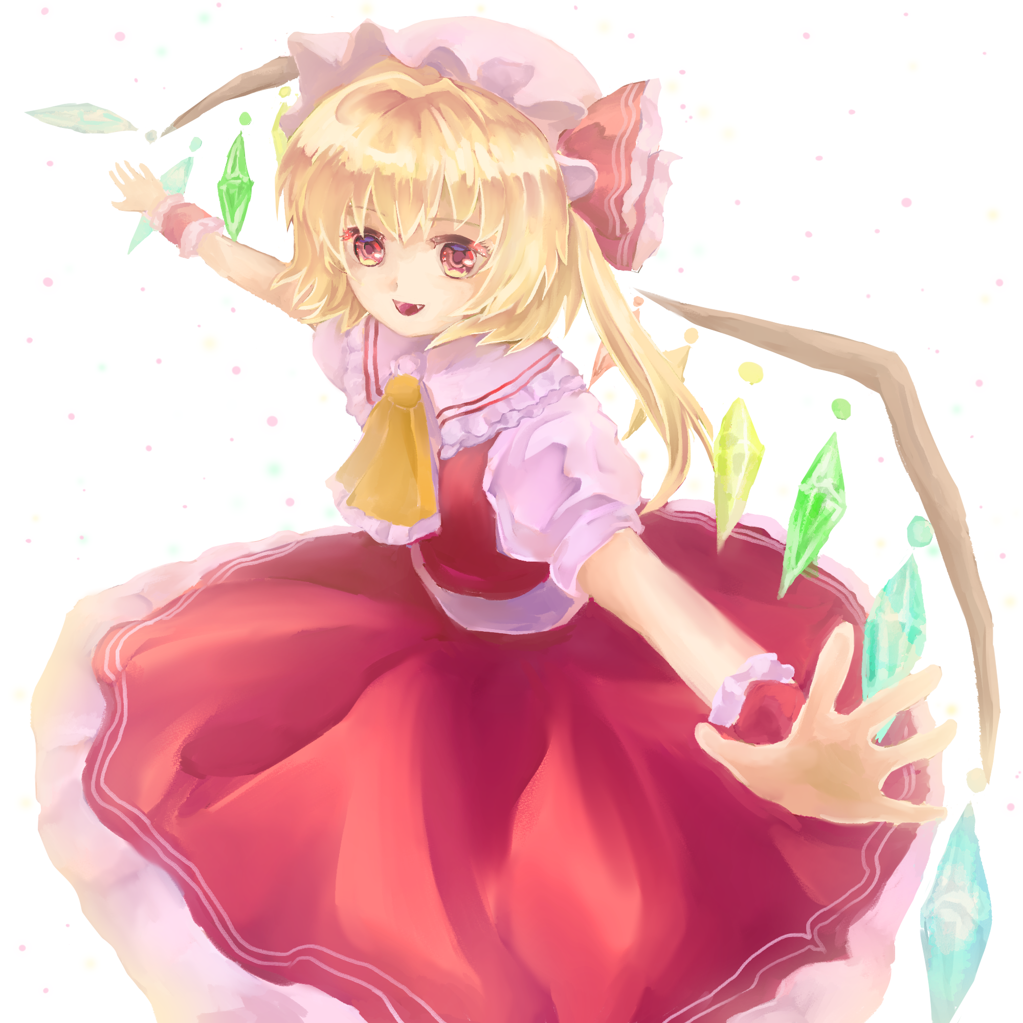 1girl ascot backlighting blonde_hair collared_shirt cowboy_shot crystal fang flandre_scarlet frilled_ascot frilled_shirt_collar frills hat highres looking_at_viewer medium_hair mikan_(manmarumikan) mob_cap multicolored_wings one_side_up open_mouth outstretched_arms red_eyes red_skirt red_vest shirt simple_background skirt skirt_set solo t-pose touhou vest white_background white_hat white_shirt wings wrist_cuffs yellow_ascot