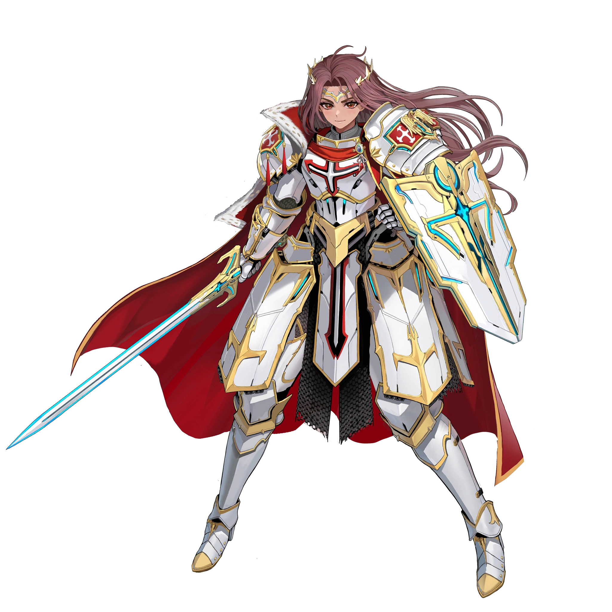 1girl ahoge arm_shield armor armored_boots blue_gem boots breastplate cape circlet couter cross cuirass cuisses dark-skinned_female dark_skin ear_piercing faulds full_body game_cg gauntlets gem gold_trim gorget greaves highres holding holding_sword holding_weapon knight last_origin light_smile lips long_hair looking_at_viewer machinery official_alternate_costume official_art pauldrons pelvic_curtain piercing poleyn prester_johanna red_cape red_eyes red_hair rerebrace sabaton shield shoulder_armor solo sword tabard tachi-e taesi third-party_source transparent_background vambraces very_long_hair weapon white_armor