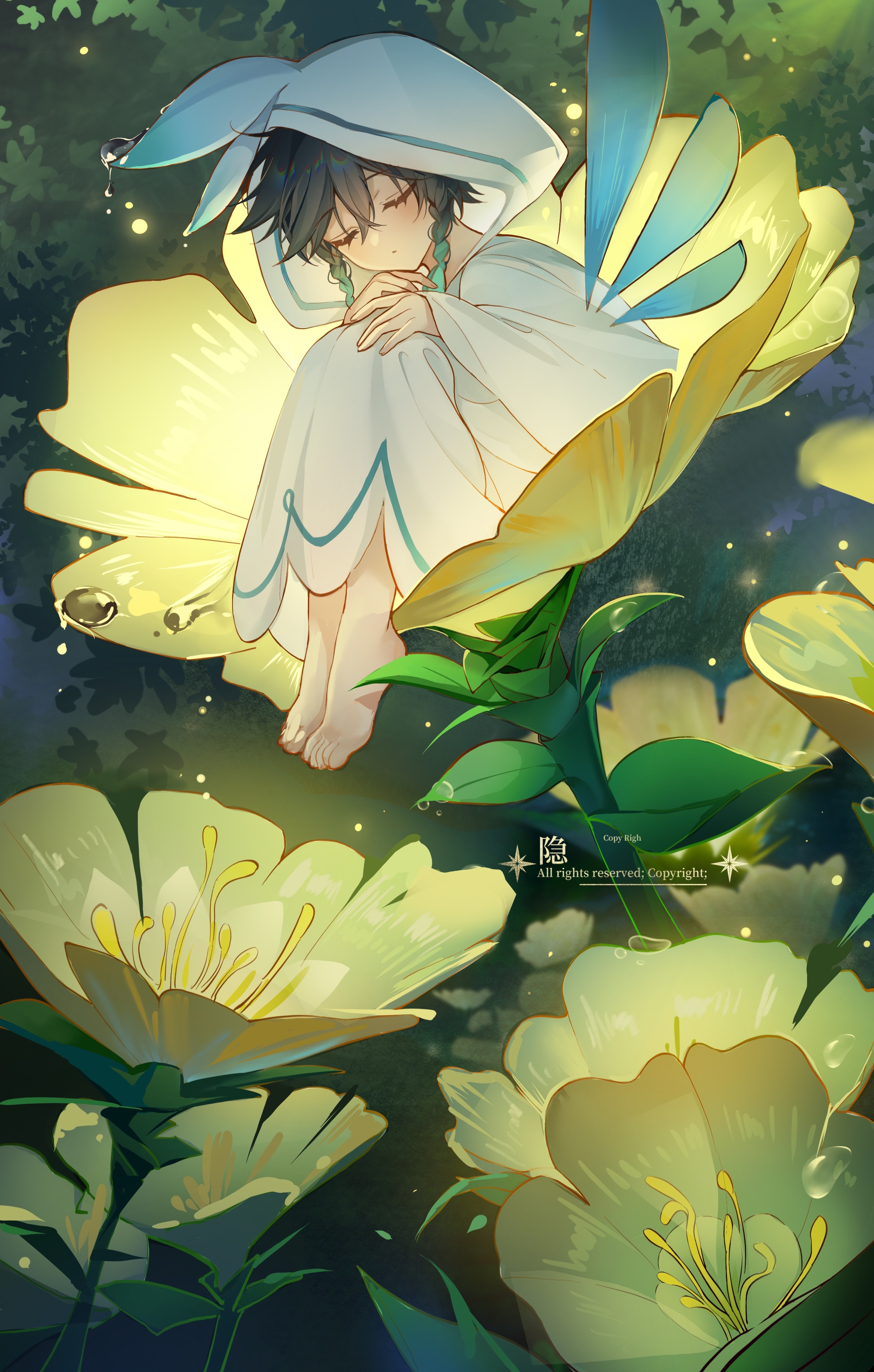 1boy absurdres aqua_hair barbatos_(genshin_impact) barefoot black_hair blush braid chinese_commentary closed_eyes closed_mouth commentary_request copyright_notice crossed_bangs eyelashes feet fireflies flower genshin_impact gradient_hair hair_between_eyes highres hood hood_up hooded_robe knees_up long_sleeves male_focus medium_hair multicolored_hair night on_flower outdoors oversized_flower plant robe side_braids solo star_(symbol) toes twin_braids venti_(genshin_impact) water water_drop watermark white_robe wide_sleeves wings yellow_flower yin01582942