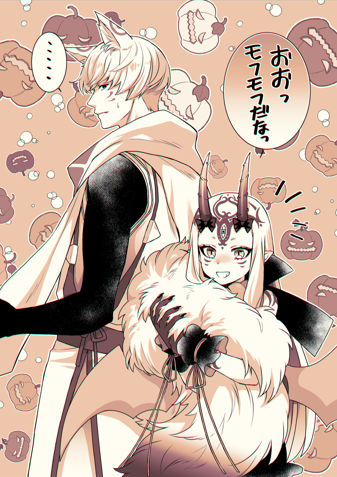 1boy 1girl alternate_costume commentary_request fate/grand_order fate_(series) gloves halloween_bucket halloween_costume highres hizuki_aya horns ibaraki_douji_(fate) long_hair oni oni_horns pumpkin short_hair tail translation_request watanabe_no_tsuna_(demonic_parade)_(fate) watanabe_no_tsuna_(fate) wings wolf_boy