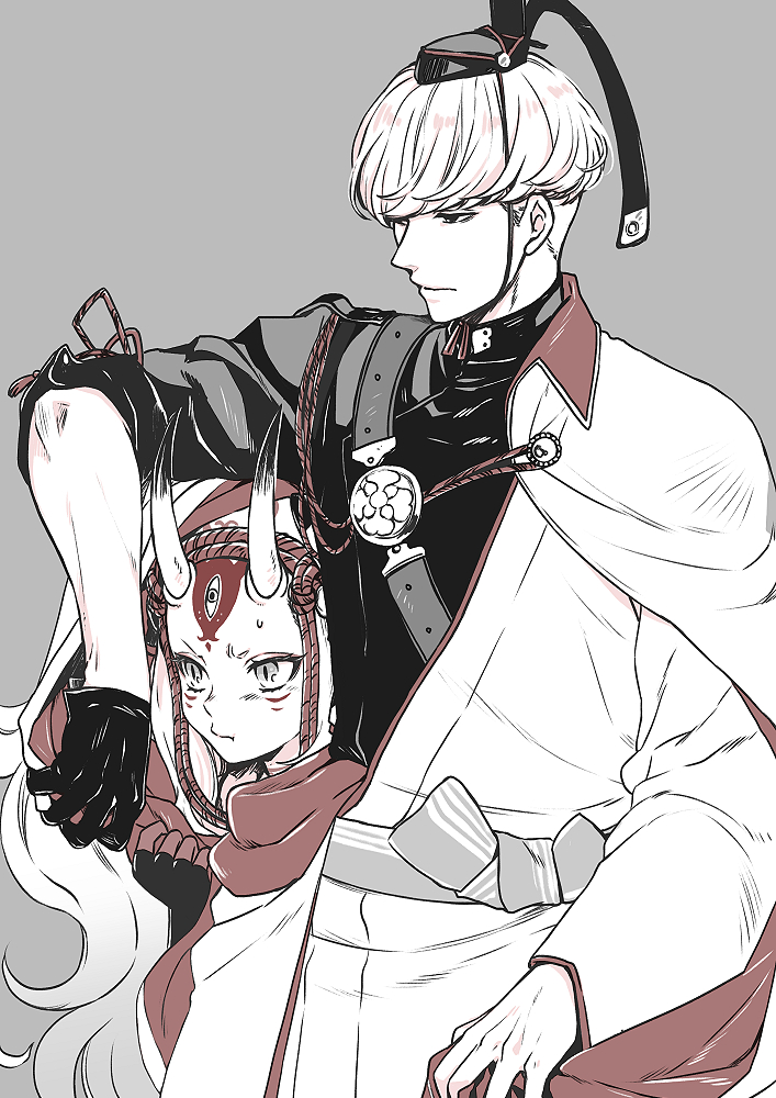 1boy 1girl black_gloves expressionless fate/grand_order fate_(series) gloves hizuki_aya horns ibaraki_douji_(fate) japanese_clothes long_hair oni oni_horns short_hair simple_background single_glove watanabe_no_tsuna_(fate)