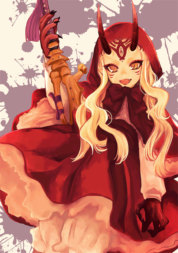 1girl alternate_costume blonde_hair bow commentary_request fate/grand_order fate_(series) hizuki_aya holding holding_sword holding_weapon hood horns ibaraki_douji_(fate) long_hair looking_at_viewer oni oni_horns smile solo sword weapon yellow_eyes