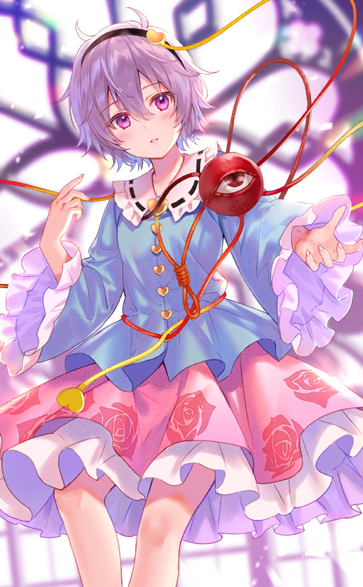 1girl black_hairband blue_shirt buttons collar collared_shirt fingernails floral_print frilled_shirt_collar frilled_skirt frilled_sleeves frills fukahire_(ruinon) game_cg hair_ornament hairband heart heart_button heart_hair_ornament heart_of_string indoors komeiji_satori light_blush long_sleeves looking_at_viewer miniskirt official_art outstretched_arm parted_lips pink_eyes pink_hair pink_skirt ribbon-trimmed_collar ribbon_trim rose_print shirt short_hair skirt solo stained_glass third_eye touhou touhou_cannonball white_collar wide_sleeves