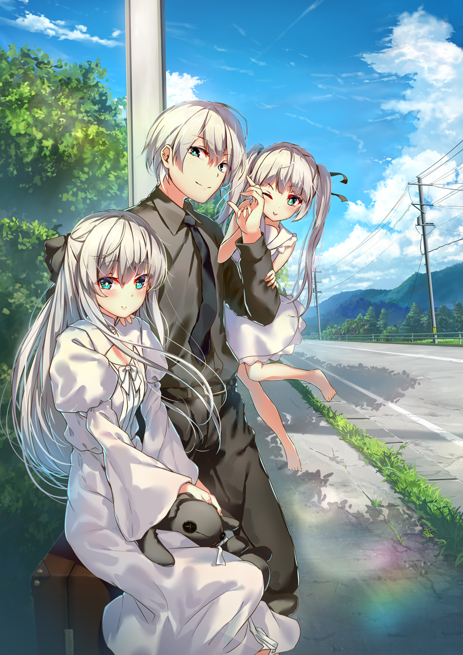 1boy 2girls aqua_eyes black_necktie black_pants black_shirt blue_eyes blue_sky brother_and_sister bush child closed_mouth cloud collared_shirt commentary day dress dress_shirt english_commentary family father_and_child father_and_daughter floating_hair grass grey_hair hair_ribbon highres if_they_mated kasugano_haruka kasugano_sora lens_flare long_hair long_sleeves looking_at_viewer mother_and_child mother_and_daughter multiple_girls necktie one_eye_closed outdoors pants parent_and_child power_lines railing ribbon road shirt siblings sitting sky sleeveless sleeveless_dress smile standing stuffed_animal stuffed_rabbit stuffed_toy suitcase tree twintails vanishing_point white_dress wide_sleeves wingheart yosuga_no_sora