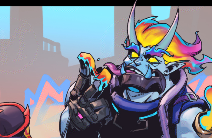 1boy 1girl black_border black_gloves black_headwear blank_eyes border briar_(league_of_legends) building colored_skin dr._mundo fiery_hair gloves horns league_of_legends looking_up male_focus muscular muscular_male official_alternate_costume official_alternate_hairstyle out_of_frame outdoors phantom_cross pointy_ears street_demon_briar street_demon_mundo street_demons_briar street_demons_mundo teeth tongue tongue_out upper_body v yellow_eyes