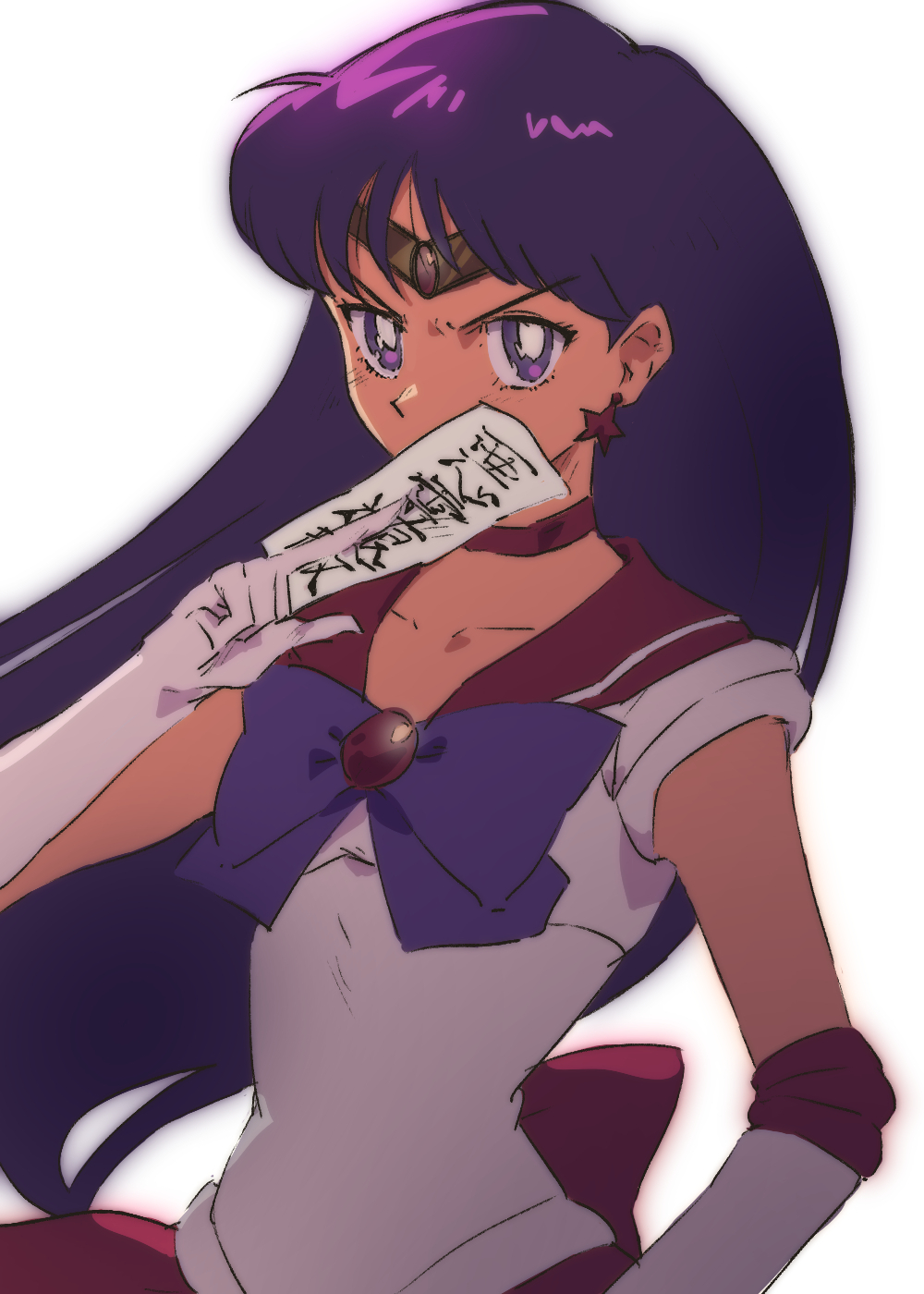 1girl ako_(hoshiya_830) angry bishoujo_senshi_sailor_moon bow earrings gloves highres hino_rei jewelry looking_at_viewer magical_girl purple_bow purple_eyes purple_hair red_skirt sailor_mars simple_background skirt solo star_(symbol) star_earrings translation_request white_background white_gloves
