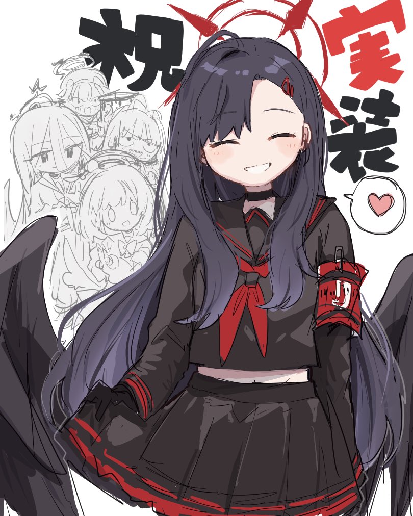 5girls ahoge armband black_gloves black_hair black_wings blue_archive choker feathered_wings gloves hair_ornament hairclip halo hasumi_(blue_archive) heart ichika_(blue_archive) koharu_(blue_archive) long_hair mashiro_(blue_archive) midriff midriff_peek multiple_girls pleated_skirt school_uniform sketch skirt spoken_heart tsurugi_(blue_archive) white_background wings wotakana_s