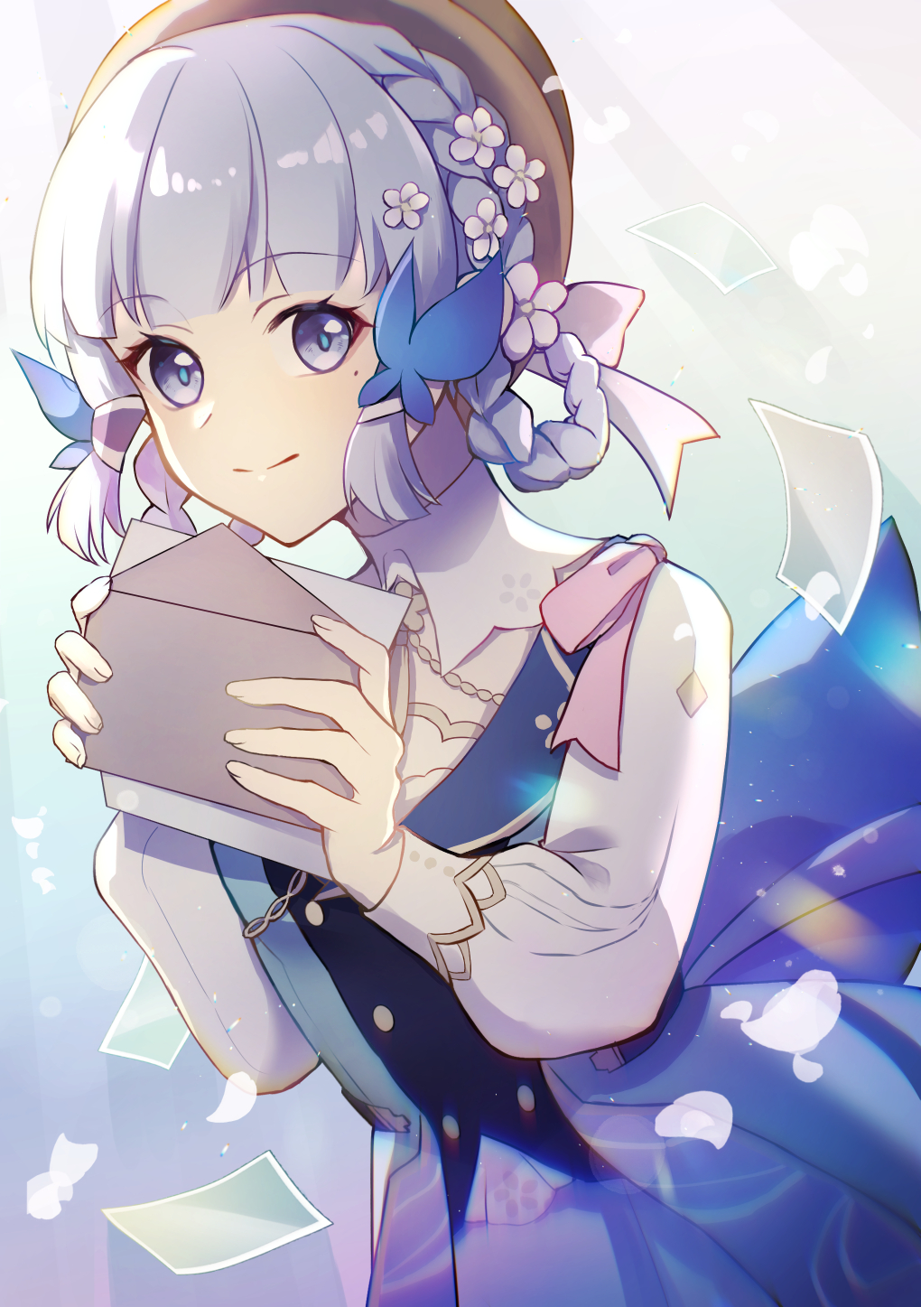 1girl 3sat0 ayaka_(genshin_impact) back_bow blue_bow blue_dress blush bow braid brown_hat butterfly_hair_ornament closed_mouth collar commentary dress genshin_impact hair_ornament hat hat_ribbon high_collar highres holding holding_letter kamisato_ayaka kamisato_ayaka_(springbloom_missive) letter long_sleeves looking_at_viewer official_alternate_costume official_alternate_hairstyle puffy_long_sleeves puffy_sleeves ribbon short_hair smile solo upper_body white_collar white_ribbon
