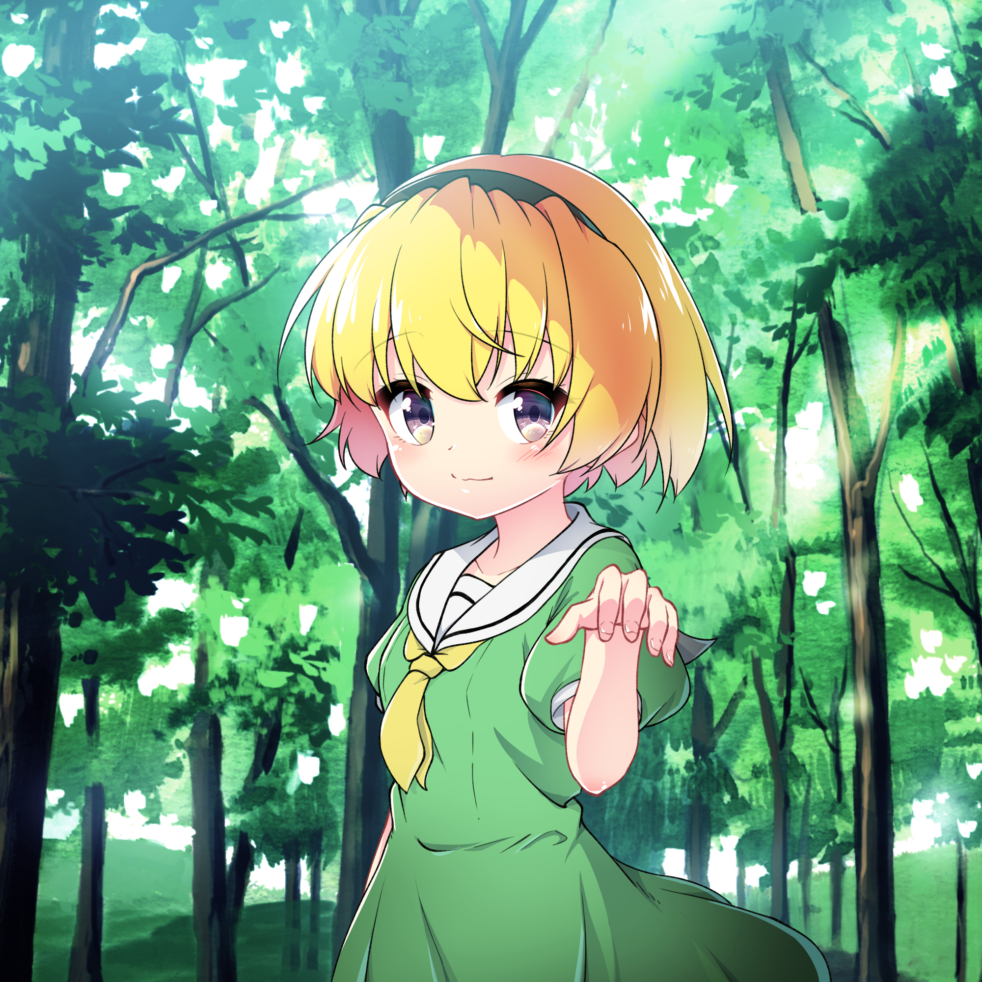 1girl black_hairband blonde_hair blush closed_mouth dress green_dress hair_between_eyes hairband hazumi_otoya highres higurashi_no_naku_koro_ni houjou_satoko looking_at_viewer neckerchief outdoors puffy_short_sleeves puffy_sleeves purple_eyes sailor_collar sailor_dress short_hair short_sleeves solo white_sailor_collar yellow_neckerchief