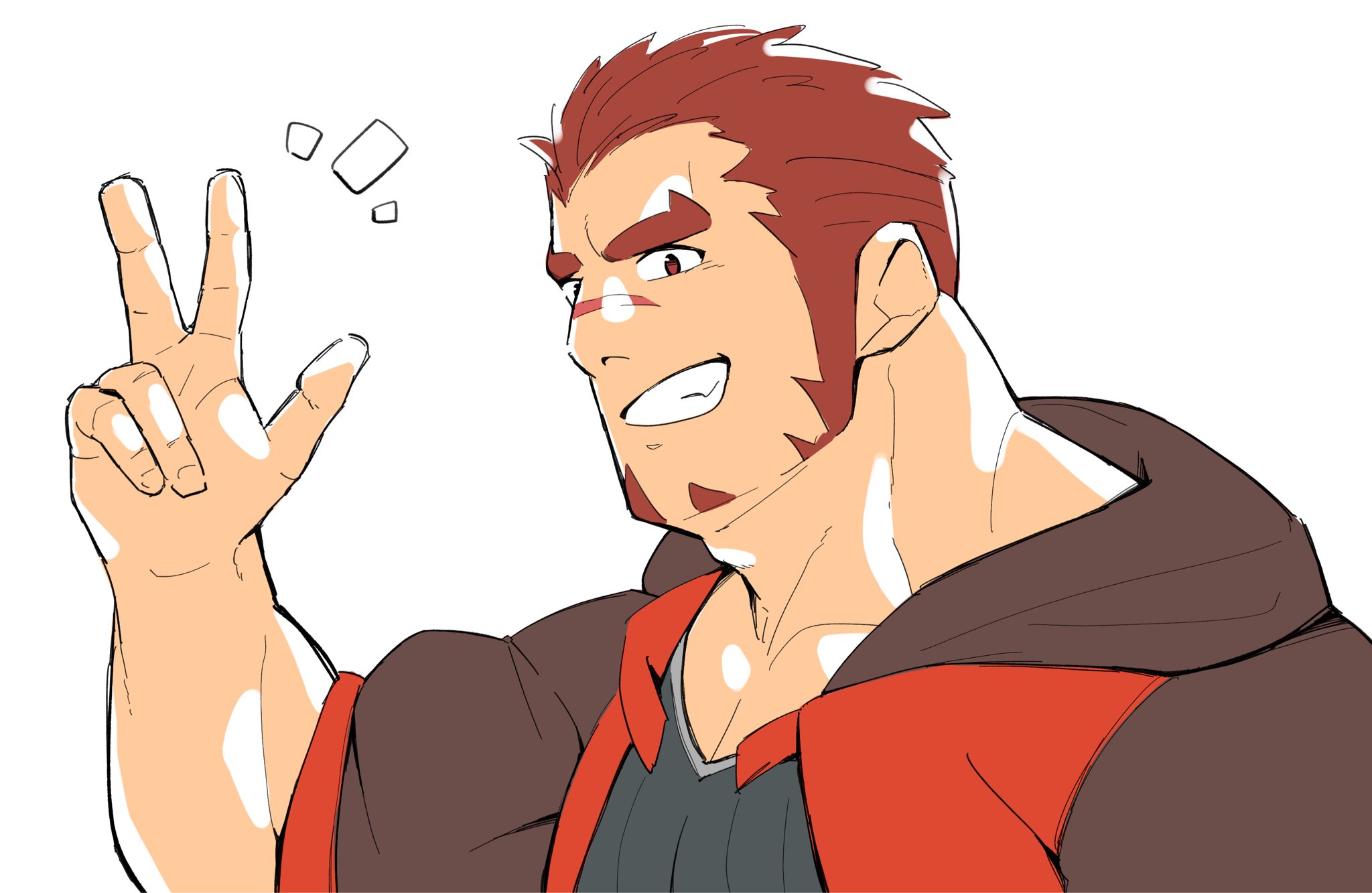 1boy akashi_(live_a_hero) bara facial_hair from_side goatee grin highres kansuke_(kansuke_717) live_a_hero long_sideburns looking_at_viewer male_focus muscular muscular_male official_alternate_costume pectoral_cleavage pectorals red_eyes red_hair sanpaku scar scar_on_face scar_on_nose short_hair sideburns simple_background smile solo thick_eyebrows v white_background