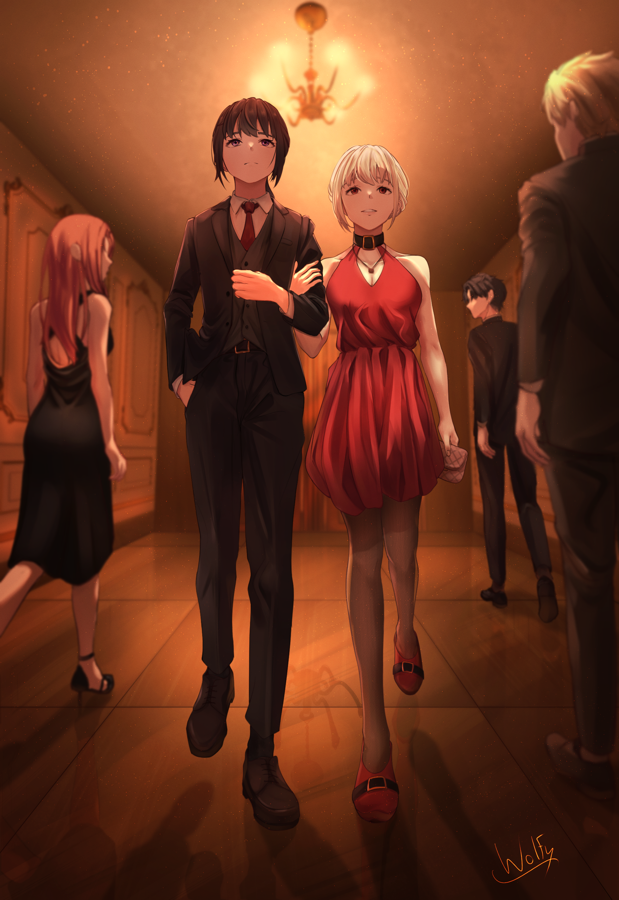 2boys 3girls absurdres bag belt belt_collar black_belt black_dress black_hair black_suit black_vest blonde_hair blurry brown_pantyhose brown_suit chxoswolf collared_shirt commentary depth_of_field dress english_commentary faceless faceless_female faceless_male formal_clothes hand_in_pocket handbag highres holding holding_bag indoors inoue_takina jewelry locked_arms long_hair looking_ahead looking_at_another lycoris_recoil multiple_boys multiple_girls necklace necktie nishikigi_chisato pantyhose ponytail purple_eyes red_dress red_eyes red_necktie reflective_floor shirt short_hair signature sleeveless sleeveless_dress smile suit vest walking white_shirt