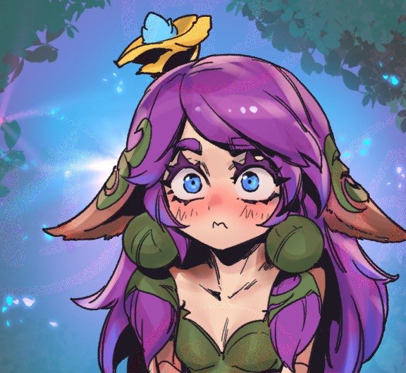 1girl animal_ears backlighting bare_shoulders blue_eyes blush breasts collarbone flower green_background hair_flower hair_ornament horse_ears league_of_legends lillia_(league_of_legends) long_hair outdoors phantom_cross pink_hair small_breasts solo tree wavy_mouth yellow_flower