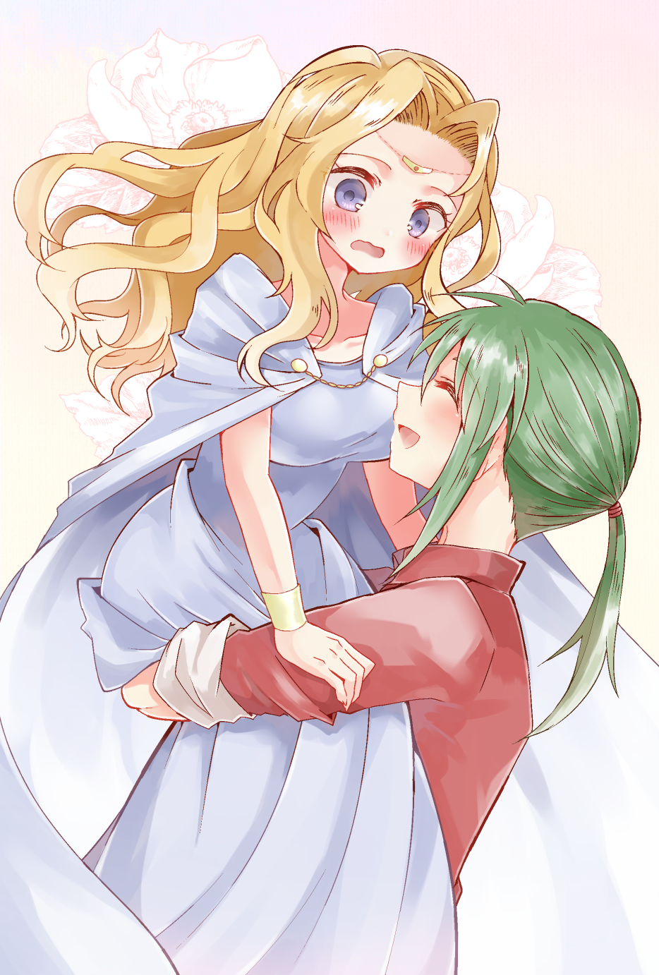 1boy 1girl ^_^ blonde_hair cape carrying circlet closed_eyes commentary_request couple dress edain_(fire_emblem) fire_emblem fire_emblem:_genealogy_of_the_holy_war green_hair hetero highres lifting_person midir_(fire_emblem) mixed-language_commentary nintendo open_mouth ponytail red_shirt shirt sui_(aruko91) surprised white_cape white_dress