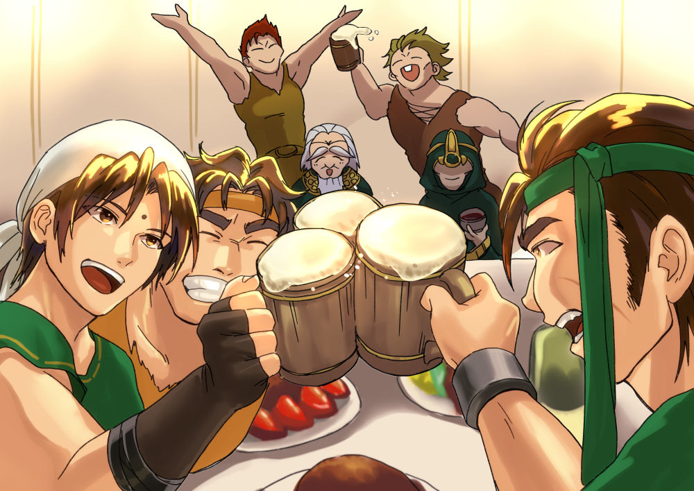 6+boys :d arms_up bandana batur_(fire_emblem) beer_mug brothers brown_hair cimbaeth_(fire_emblem) closed_eyes cup dimaggio fire_emblem fire_emblem:_genealogy_of_the_holy_war food gerard_(fire_emblem) green_hood jamke_(fire_emblem) masu_d mug multiple_boys munnir nintendo open_mouth sandima siblings smile teeth toasting_(gesture) white_bandana