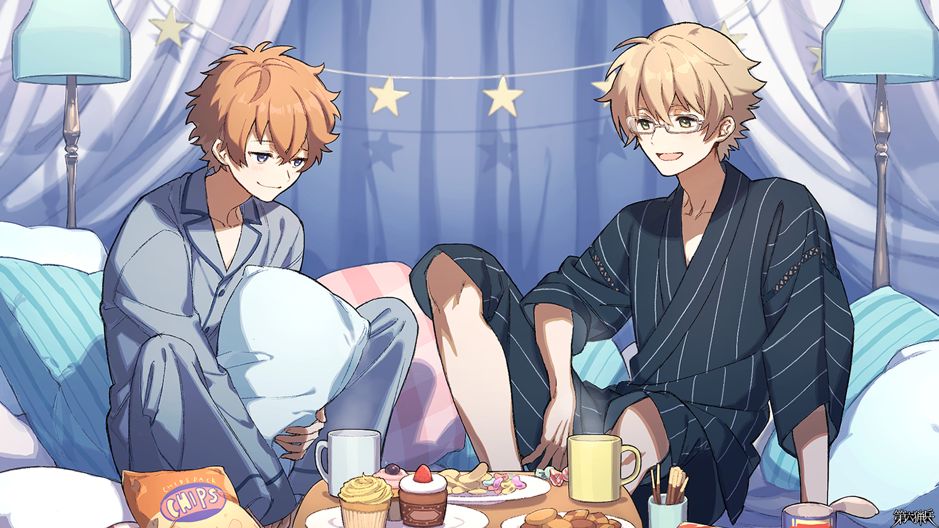 2boys :d bag_of_chips black_kimono brown_hair checkerboard_cookie cookie copyright_name cup cupcake dairoku_ryouhei food glasses grey_pajamas highres indoors japanese_clothes kimono knee_up kusano_chiaki kuze_shizuki lamp male_focus mug multiple_boys open_mouth pajamas pillow pocky purple_eyes sitting smile star_(symbol) umou_tw