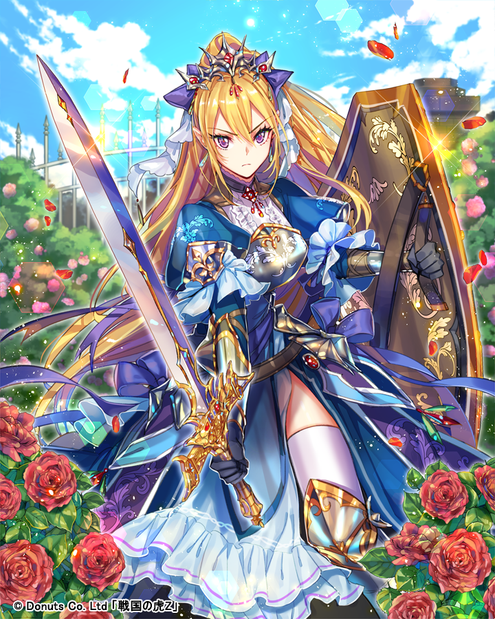 1girl aiming aiming_at_viewer armor armored_dress belt black_belt black_gloves blonde_hair blue_dress bow breastplate bush center_frills closed_mouth cloud copyright_notice day double-parted_bangs dress dress_bow earrings falling_petals faulds feet_out_of_frame fence fighting_stance flower frilled_dress frills gloves hair_between_eyes hair_bow holding holding_shield holding_sword holding_weapon jewelry juliet_sleeves light_particles long_hair long_sleeves looking_at_viewer official_art outdoors petals pink_flower pink_rose pointy_ears poleyn puffy_sleeves purple_bow purple_eyes red_flower red_rose rose rose_bush sengoku_no_tora_z shield shirt side_slit sila_(carpen) solo standing sword thighhighs tiara v-shaped_eyebrows vambraces weapon white_shirt white_thighhighs wide_ponytail