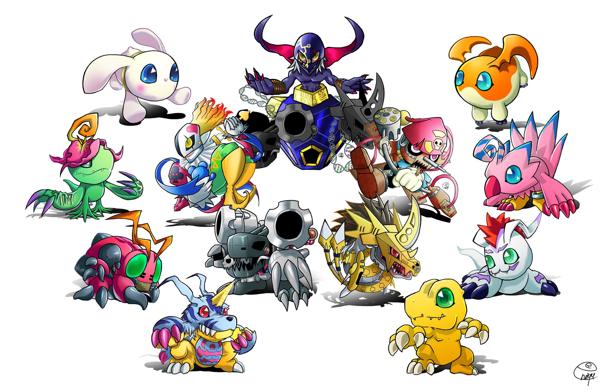 agumon antennae apocalymon bird bug cat claws digimon digimon_(creature) exoskeleton flower gabumon gomamon highres metalseadramon monster_girl mugendramon palmon patamon petals piemon pinochimon piyomon plant_girl reptile sharp_teeth spikes tailmon teeth tentomon wings