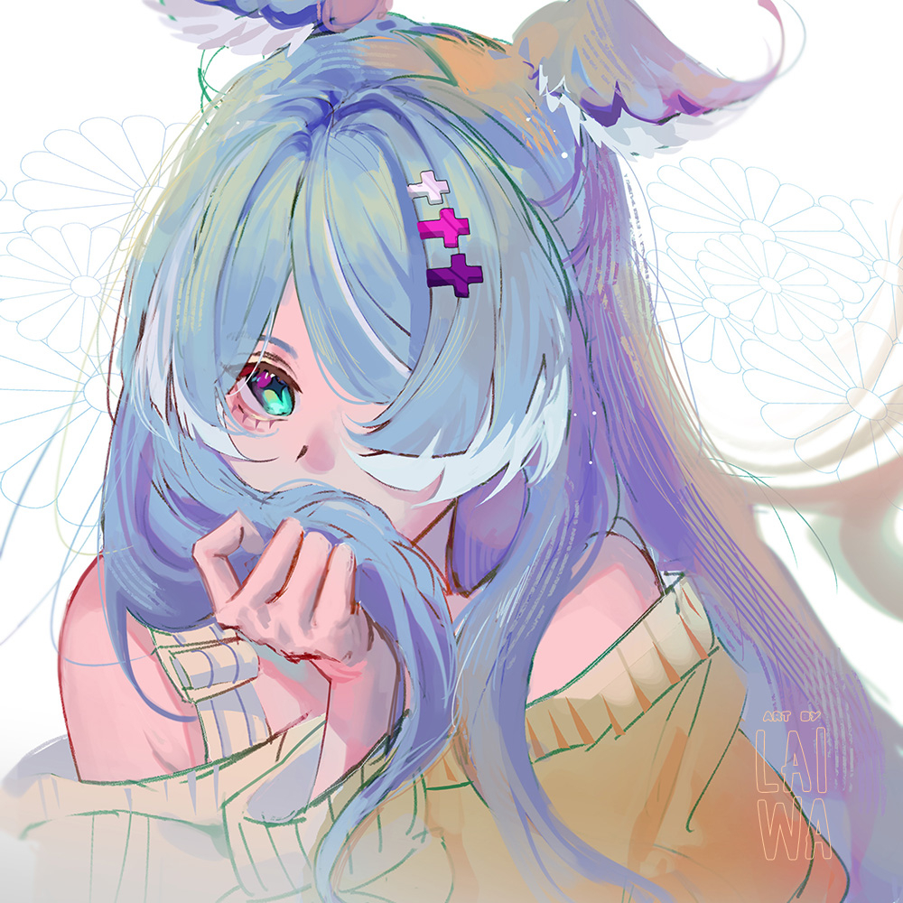 1girl aqua_eyes blue_hair blue_wings covering_own_mouth elira_pendora hair_over_one_eye head_wings holding holding_own_hair laiwa long_hair nijisanji nijisanji_en off-shoulder_sweater off_shoulder one_eye_covered solo sweater virtual_youtuber wings yellow_sweater
