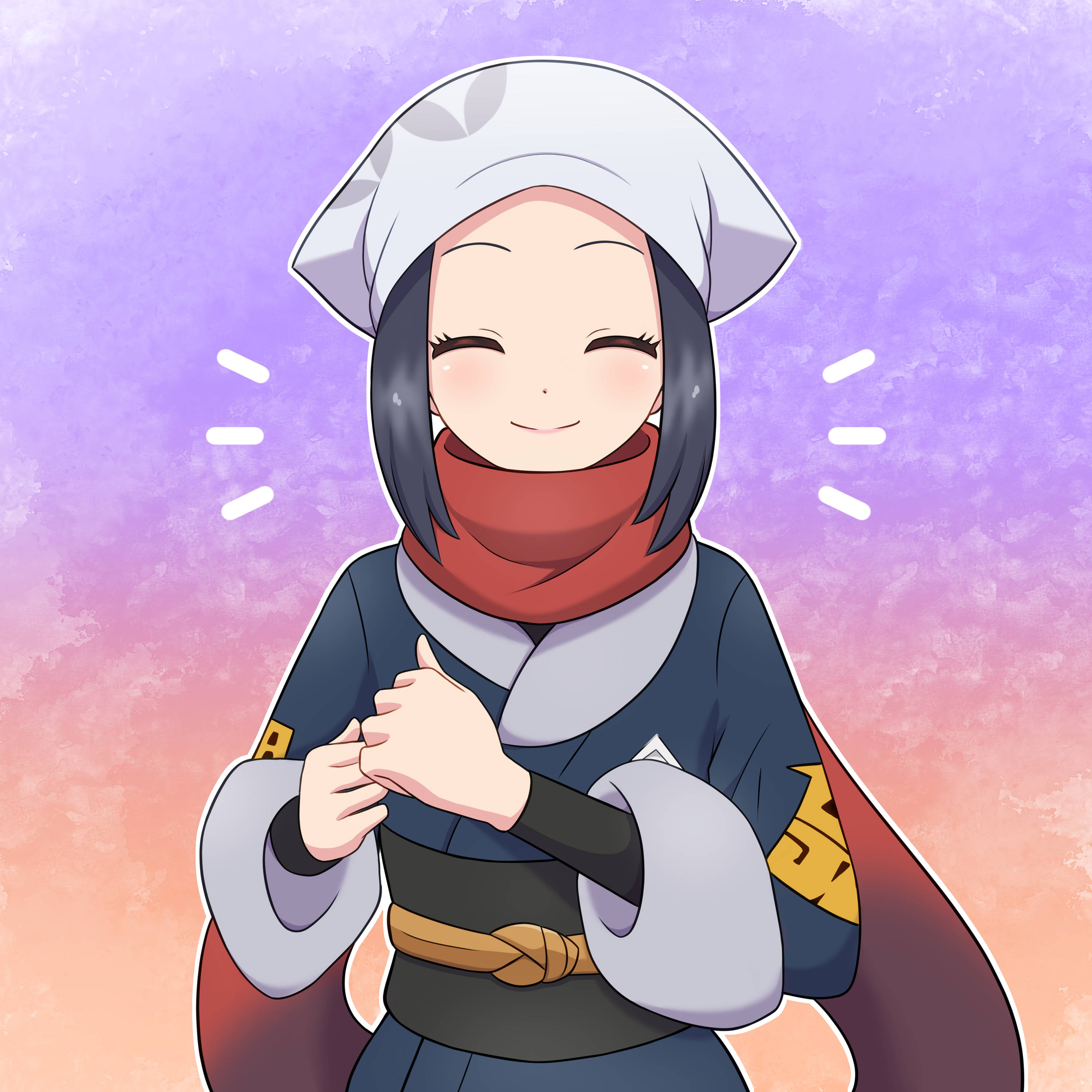 1girl absurdres akari_(pokemon) black_hair black_shirt blush closed_eyes closed_mouth commentary_request eyelashes facing_viewer headscarf highres jacket nintendo notice_lines outline pokemon pokemon_legends:_arceus red_scarf sash scarf shirt sidelocks smile solo upper_body white_headscarf white_headwear yuu_(jgvj7873)