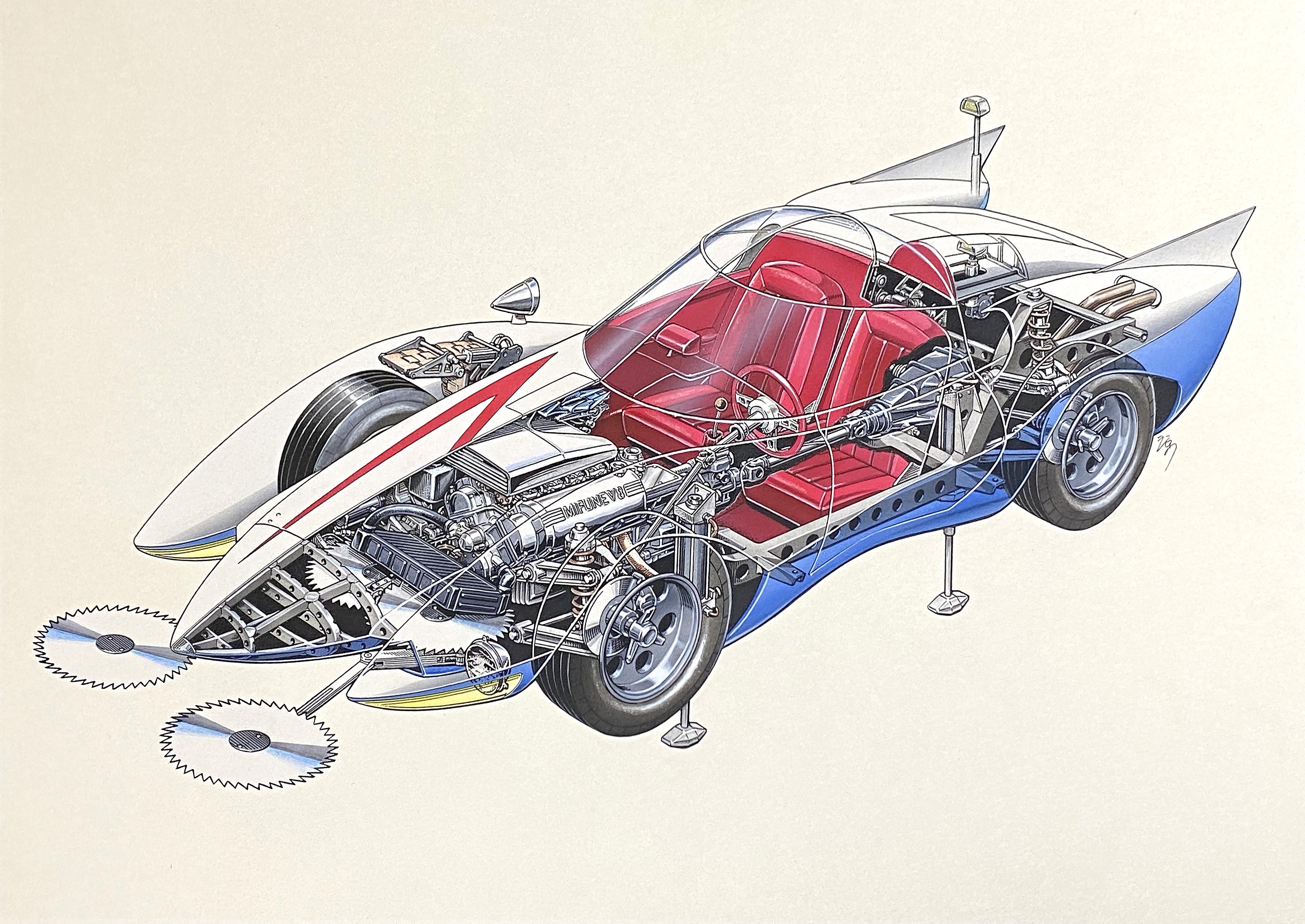 absurdres brown_background car car_interior circular_saw engine highres mach_5 mach_go_go_go motor_vehicle no_humans race_vehicle racecar saw signature steering_wheel vehicle_focus x-ray yamada_jiro_(artist)