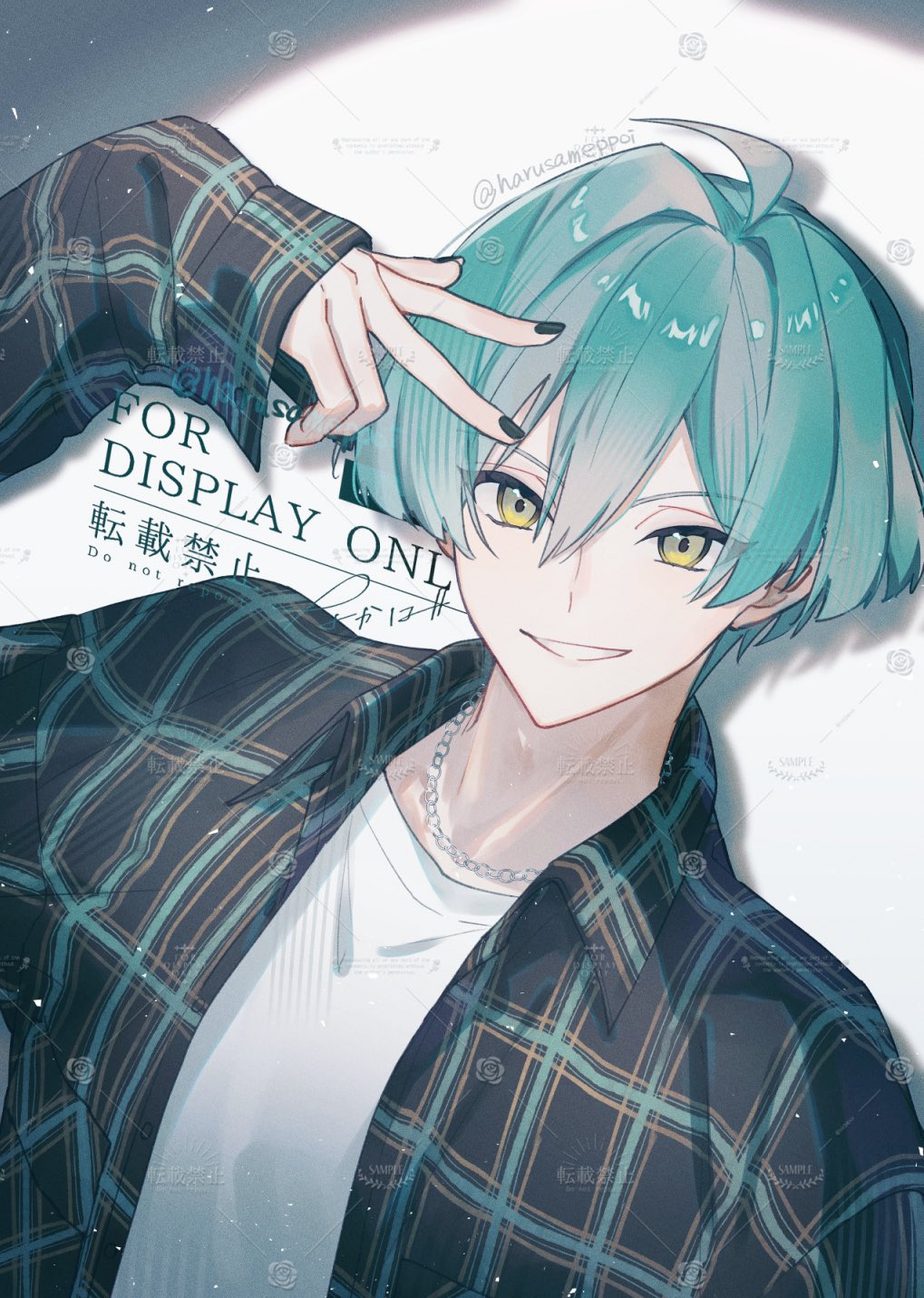 1boy ahoge aqua_hair flannel green_eyes grey_background harusameppoi highres idolish7 isumi_haruka jewelry long_sleeves looking_at_viewer male_focus multicolored_background necklace shirt short_hair smile solo teeth twitter_username watermark white_background white_shirt