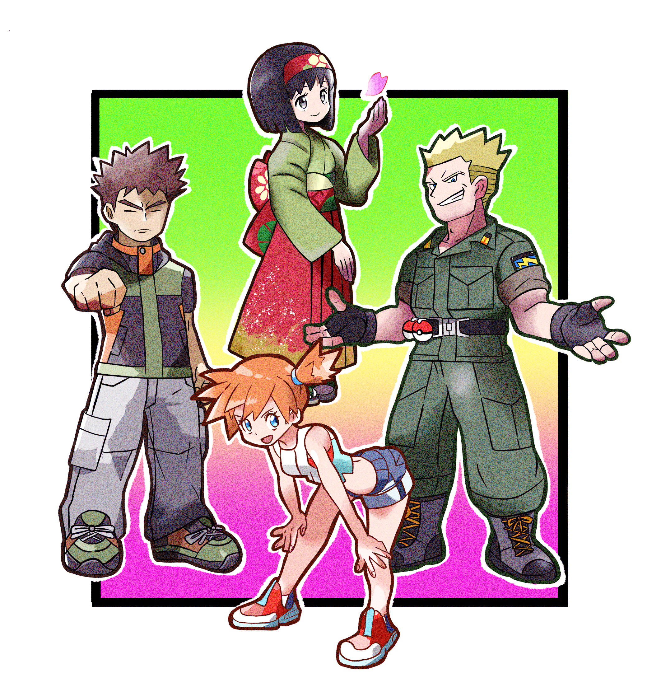 2boys 2girls asymmetrical_hair blonde_hair brock_(pokemon) brown_hair denim denim_shorts derivative_work erika_(pokemon) gen_1_pokemon gym_leader highres misty_(pokemon) multiple_boys multiple_girls muscular nintendo pokemon pokemon:_let's_go_pikachu!_and_let's_go_eevee! ponytail shirt short_hair shorts side_ponytail smile lt._surge white_shirt