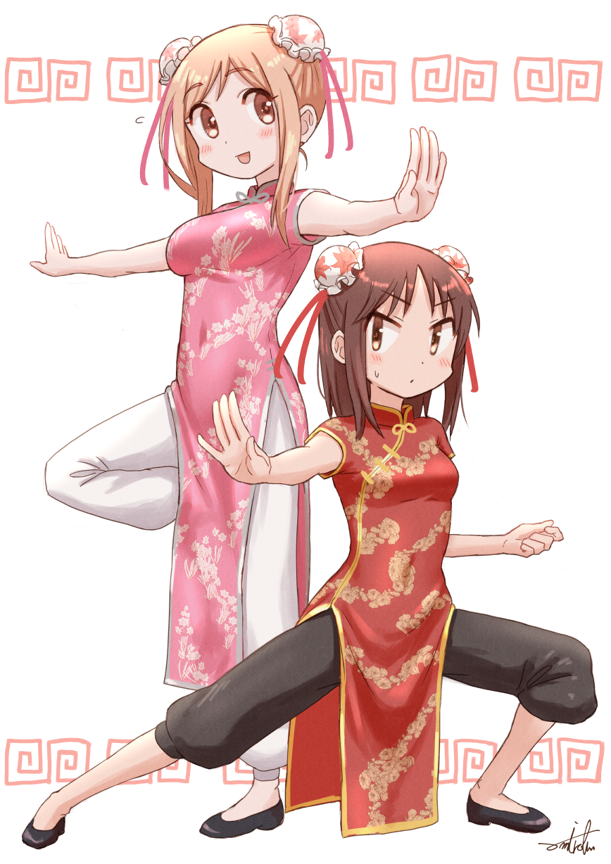 2girls :d aikawa_chiho bare_arms black_footwear black_pants blush breasts brown_eyes brown_hair bun_cover china_dress chinese_clothes closed_mouth commentary_request covered_navel double_bun dress flying_sweatdrops hair_bun highres light_brown_hair medium_breasts multiple_girls okano_kei open_mouth outstretched_arms pants parted_bangs puffy_pants shoes simple_background small_breasts smile spread_arms standing standing_on_one_leg sweat umiroku white_background white_pants yuyushiki