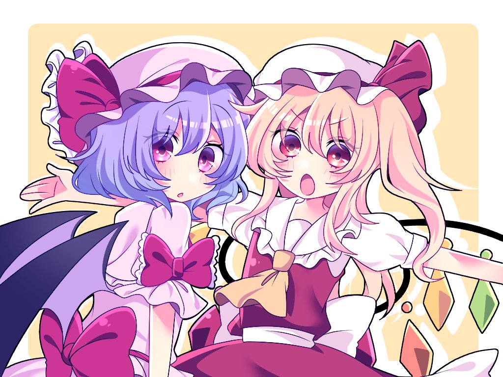 2girls ascot bat_wings blonde_hair blush breasts crystal flandre_scarlet hair_between_eyes hat hat_ribbon looking_at_viewer medium_hair mob_cap multicolored_wings multiple_girls open_mouth outstretched_arms puffy_short_sleeves puffy_sleeves purple_eyes purple_hair purple_headwear red_eyes red_skirt red_vest remilia_scarlet ribbon short_sleeves siblings simple_background sisters skirt small_breasts touhou tsugomori_(remilia0398) vest white_headwear wings yellow_ascot