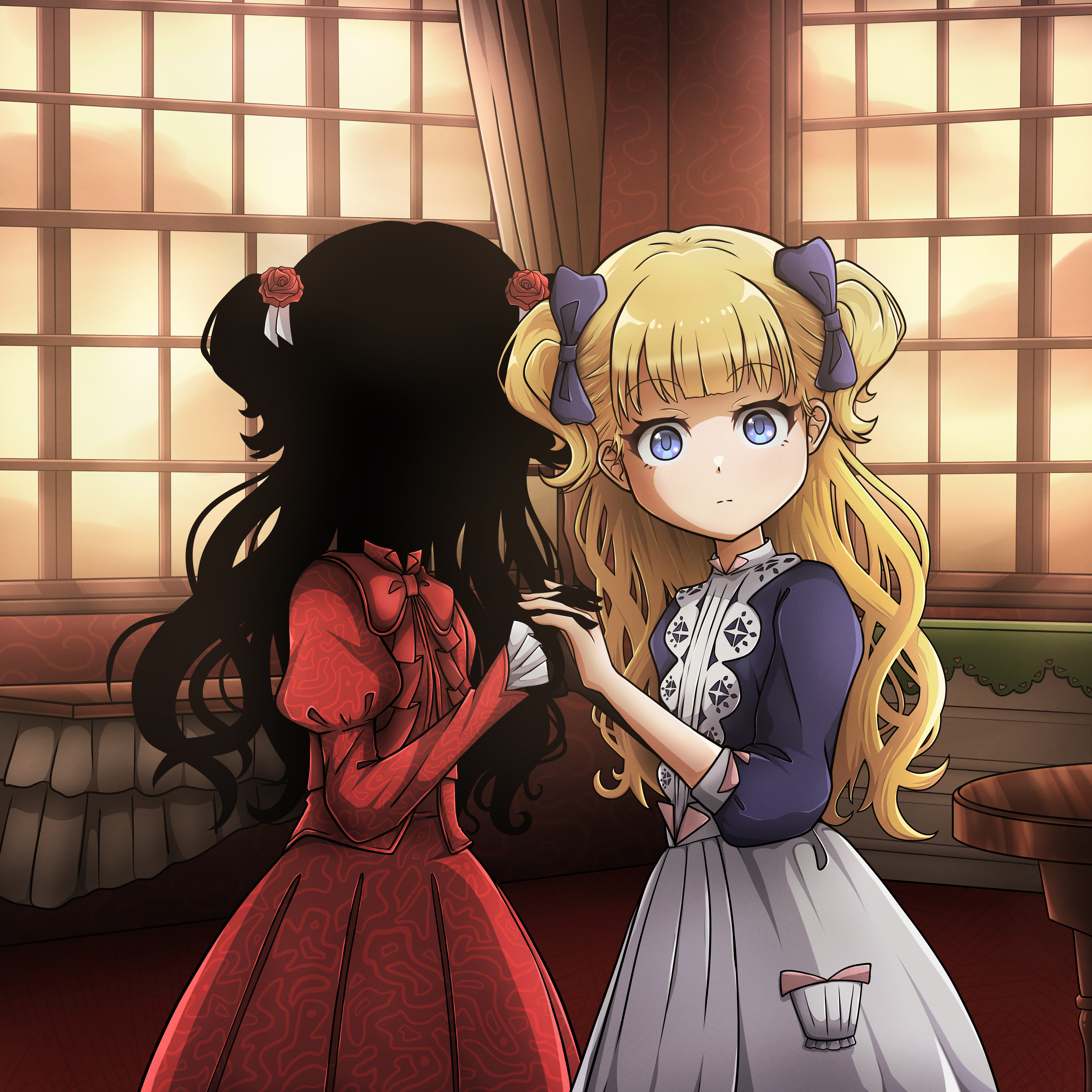 2girls absurdres black_hair blonde_hair blue_bow blue_eyes bow closed_mouth dress emilico_(shadows_house) flower hair_bow hair_flower hair_ornament highres holding_hands kamen_art123 kate_(shadows_house) living_doll_uniform looking_at_viewer multiple_girls red_dress red_flower shadow_(shadows_house) shadows_house standing table twintails window