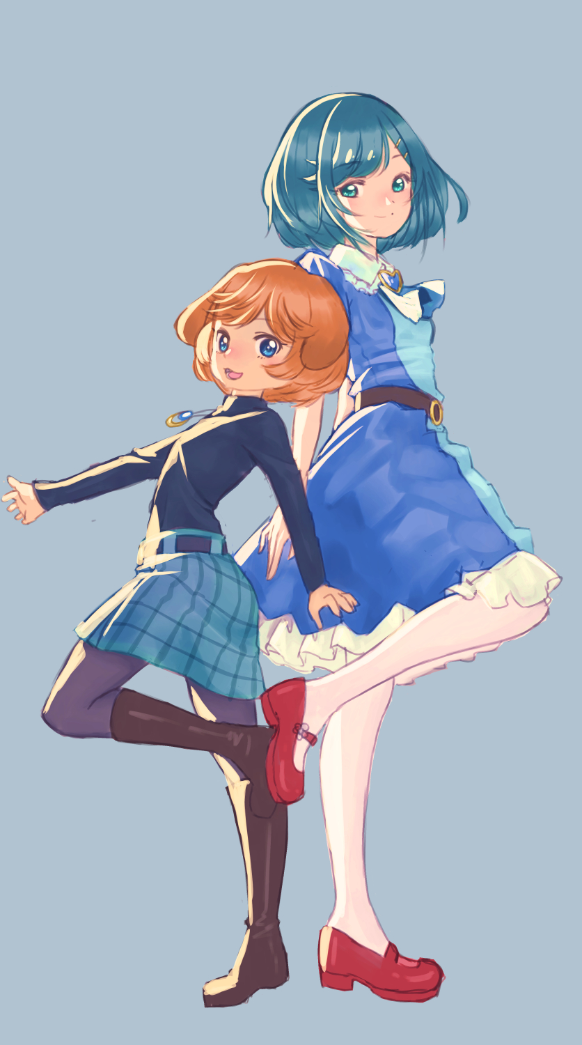 animal_ears ascot back-to-back belt black_belt black_footwear black_shirt blue_ascot blue_dress blue_eyes blue_hair blue_skirt bob_cut boots brooch closed_mouth collared_dress cosplay costume_switch delicious_party_precure dog_ears dog_girl dress frilled_dress frills from_side fuwa_kokone grey_background grey_pantyhose hair_ornament hairclip heart heart_brooch highres jewelry jj_(ssspulse) long_sleeves looking_at_viewer mary_janes miniskirt necklace open_mouth pam-pam pam-pam_(human) pantyhose plaid_clothes plaid_skirt precure red_footwear shirt shoes short_hair short_sleeves simple_background skirt smile standing turtleneck white_pantyhose