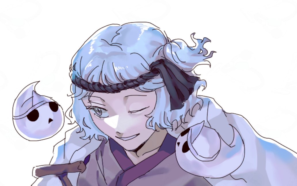 1other androgynous black_headband black_ribbon blue_hair collarbone colored_eyelashes commentary fujiwara_no_iyozane ghost_(len'en) grey_eyes hair_ribbon headband holding holding_oar jacket jacket_on_shoulders japanese_clothes kimono len'en light_blue_hair looking_at_another oar one_eye_closed one_side_up open_mouth purple_kimono ribbon short_hair smile sodaon teeth triangle_mouth triangular_headpiece upper_body white_background white_jacket