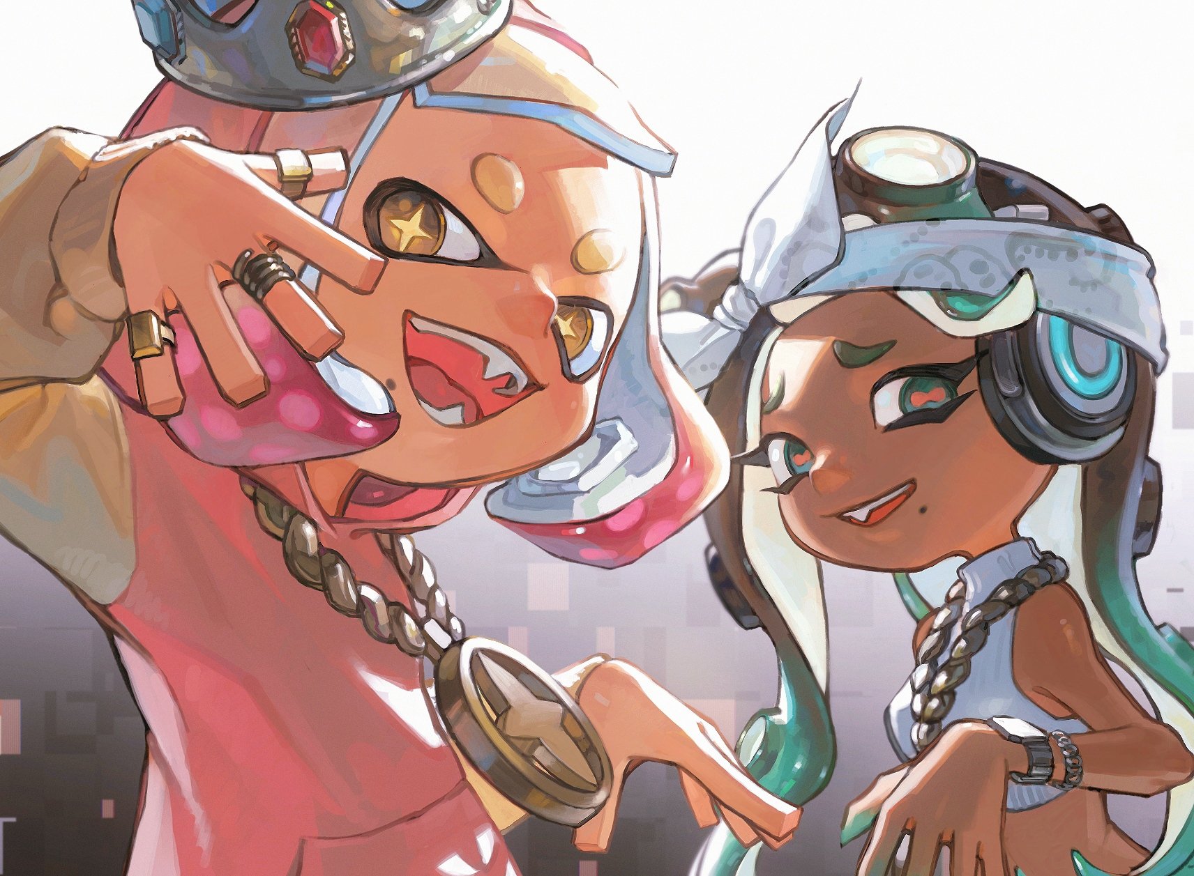 +_+ 2girls artist_request bare_shoulders breasts crop_top cropped_sweater crown dark-skinned_female dark_skin flat_chest headphones highres jewelry long_sleeves marina_(dj_hyperfresh)_(splatoon) marina_(splatoon) medium_breasts megamiko multiple_girls nintendo octoling pearl_(mc.princess)_(splatoon) pearl_(splatoon) ring sleeveless splatoon_(series) splatoon_2 splatoon_2:_octo_expansion sweater tentacle_hair