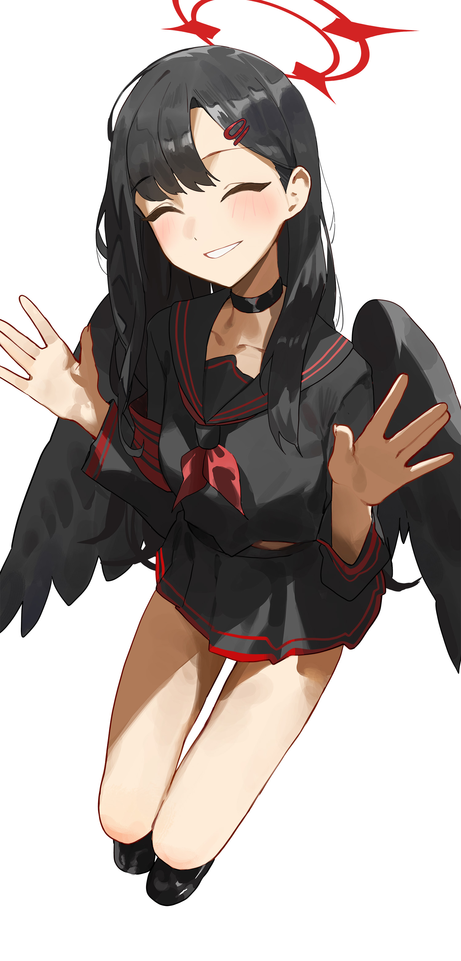 1girl absurdres black_choker black_hair black_serafuku black_wings blue_archive blush choker closed_eyes hair_ornament hairclip halo highres ichika_(blue_archive) kji_(rozo) long_hair long_sleeves neckerchief red_halo red_neckerchief school_uniform serafuku skirt smile solo wings