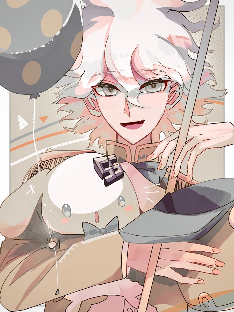 1boy :d :o balloon blonde_hair brown_hat brown_jacket brown_nails danganronpa_(series) danganronpa_2:_goodbye_despair doll grey_eyes grey_hair hair_between_eyes hat holding holding_balloon holding_doll jacket kata_tsumurou komaeda_nagito long_sleeves messy_hair multicolored_background multicolored_hair nail_polish number_hair_ornament open_mouth polka_dot_balloon smile solo unworn_hat unworn_headwear upper_body