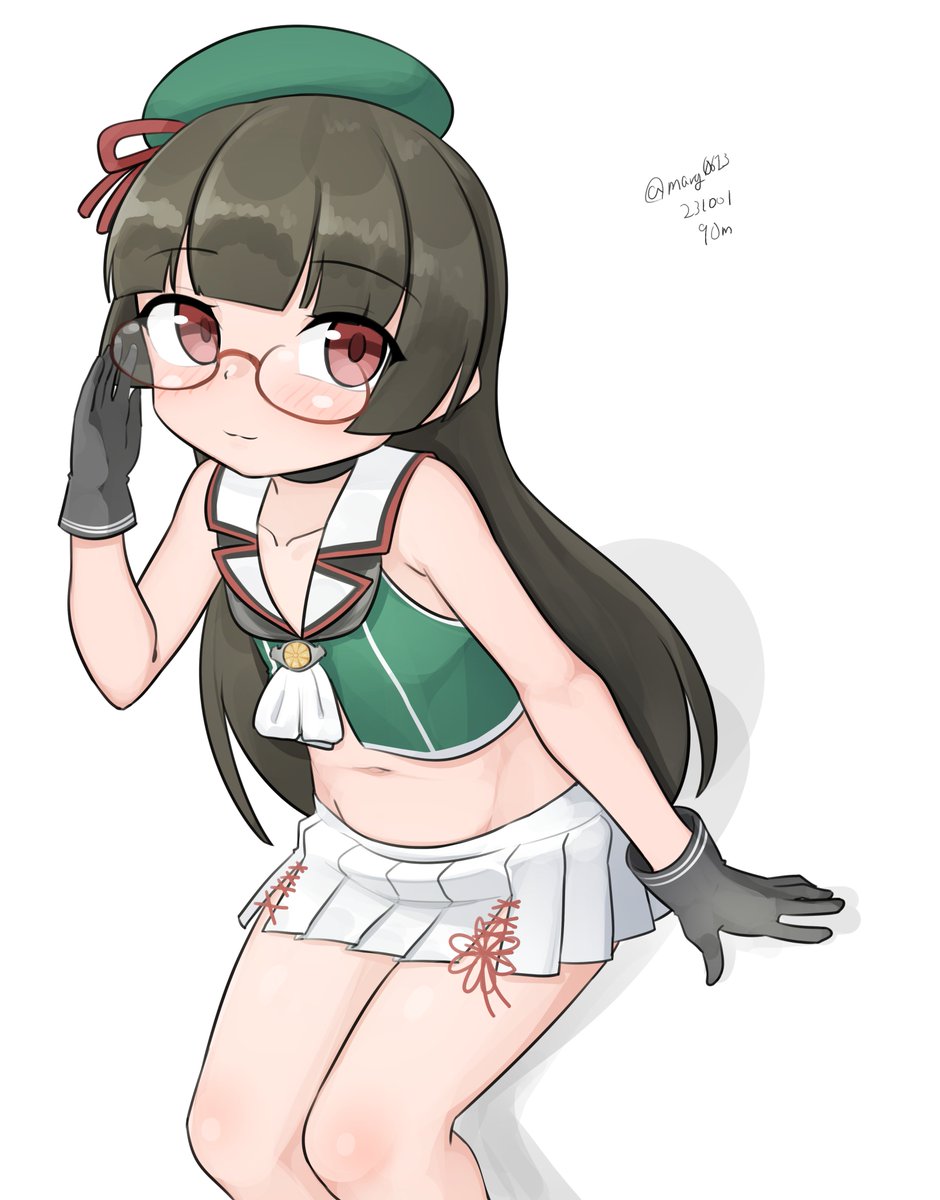 1girl adjusting_eyewear aged_down beret black_gloves black_hair blunt_bangs bob_cut choukai_(kancolle) choukai_kai_ni_(kancolle) crop_top dated dress feet_out_of_frame gloves green_hat green_shirt hat highres inverted_bob kantai_collection long_hair maru_(marg0613) midriff neckerchief one-hour_drawing_challenge pleated_dress red-framed_eyewear red_eyes sailor_collar semi-rimless_eyewear shirt simple_background skirt sleeveless sleeveless_shirt solo twitter_username white_background white_neckerchief white_sailor_collar white_skirt