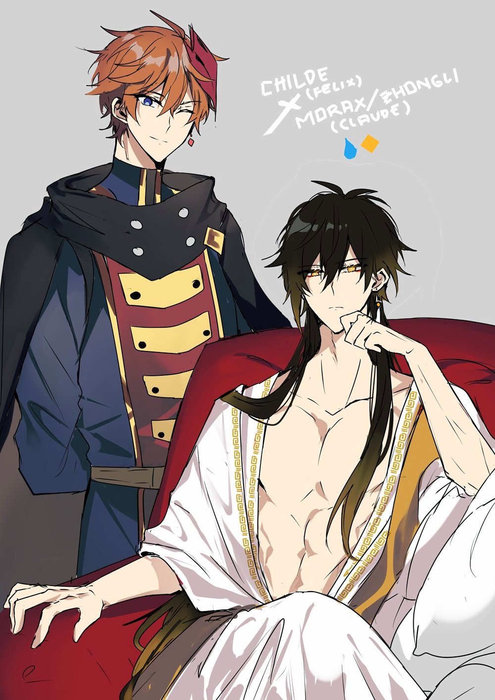 2boys alternate_costume bare_pectorals crossed_legs efu_(angelschatedral99) genshin_impact hand_to_chin highres looking_at_viewer multiple_boys one_eye_closed pectorals sitting standing tartaglia_(genshin_impact) wink zhongli_(genshin_impact)