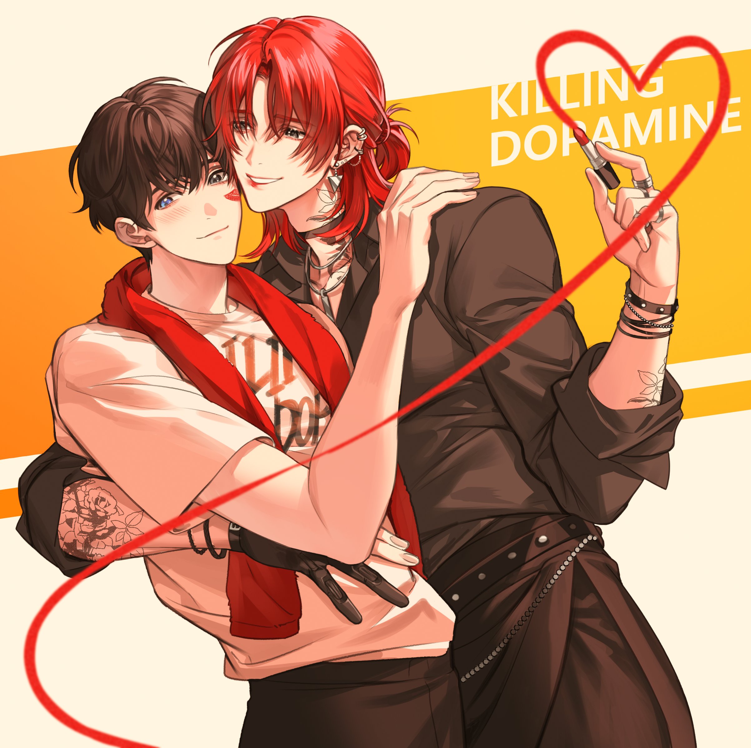 2boys arm_tattoo black_hair blue_eyes blush closed_mouth commentary_request cosmetics ear_piercing earrings english_text eoduun_badaui_deungbul-i_doeeo flower_tattoo grey_eyes hand_on_another's_shoulder heart heterochromia highres holding jewelry kim_jaehee korean_commentary lipstick_mark lipstick_tube male_focus multiple_boys multiple_earrings neck_tattoo necklace padakpadak_88 park_moo-hyun piercing ponytail prosthetic_fingers red_hair lipstick_tube ring shirt short_hair short_sleeves simple_background smile standing tattoo triangle_earrings white_background white_shirt yaoi